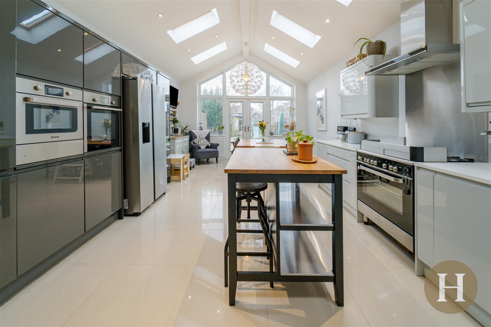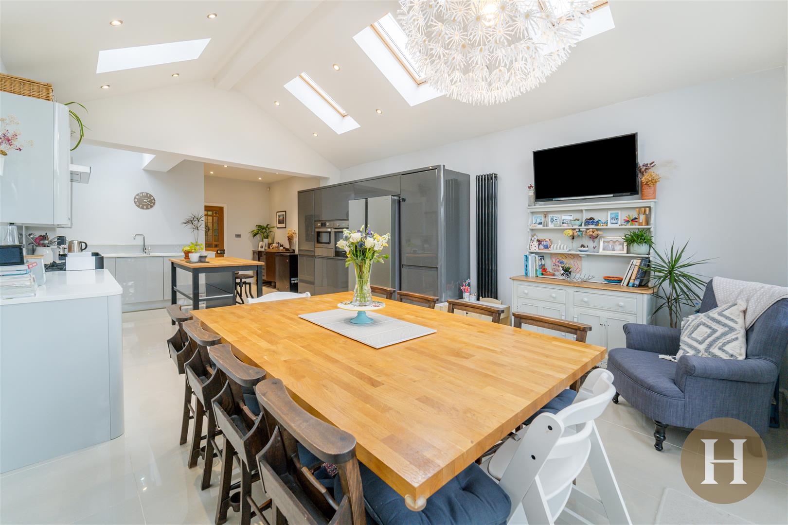 Kitchen Diner - Boasting an impressive extension, the kitchen diner benefits from a range of base, drawer and wall units. Including sunken stainless steel sink and Corian work surface. Space for American style fridge/ freezer, stainless steel range cooker and extractor hood over. Natural light floods the room with seven Velux style windows, patio doors and window to the rear elevation. The kitchen further boasts integrated appliances including dishwasher. Ceiling light point, spotlights and polished tiled flooring.