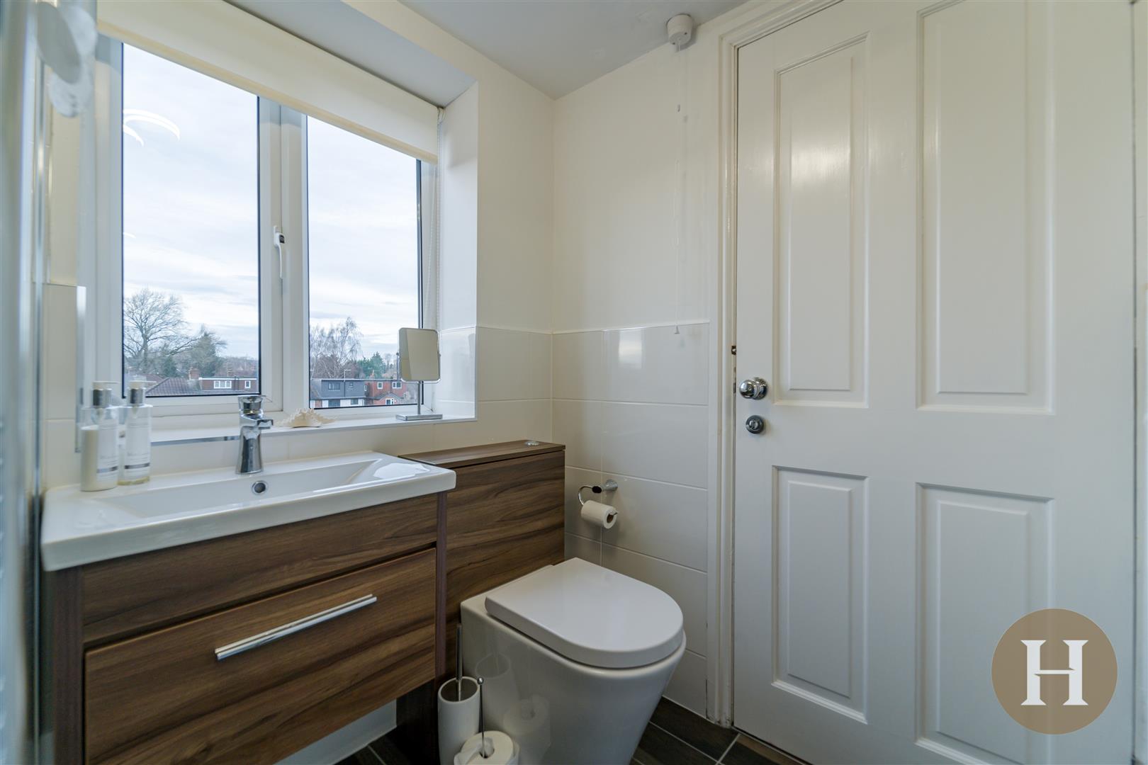 Ensuite - Low level flush WC, vanity unit and walk in mains shower. Partially tiled walls, towel radiator and window to the rear elevation.