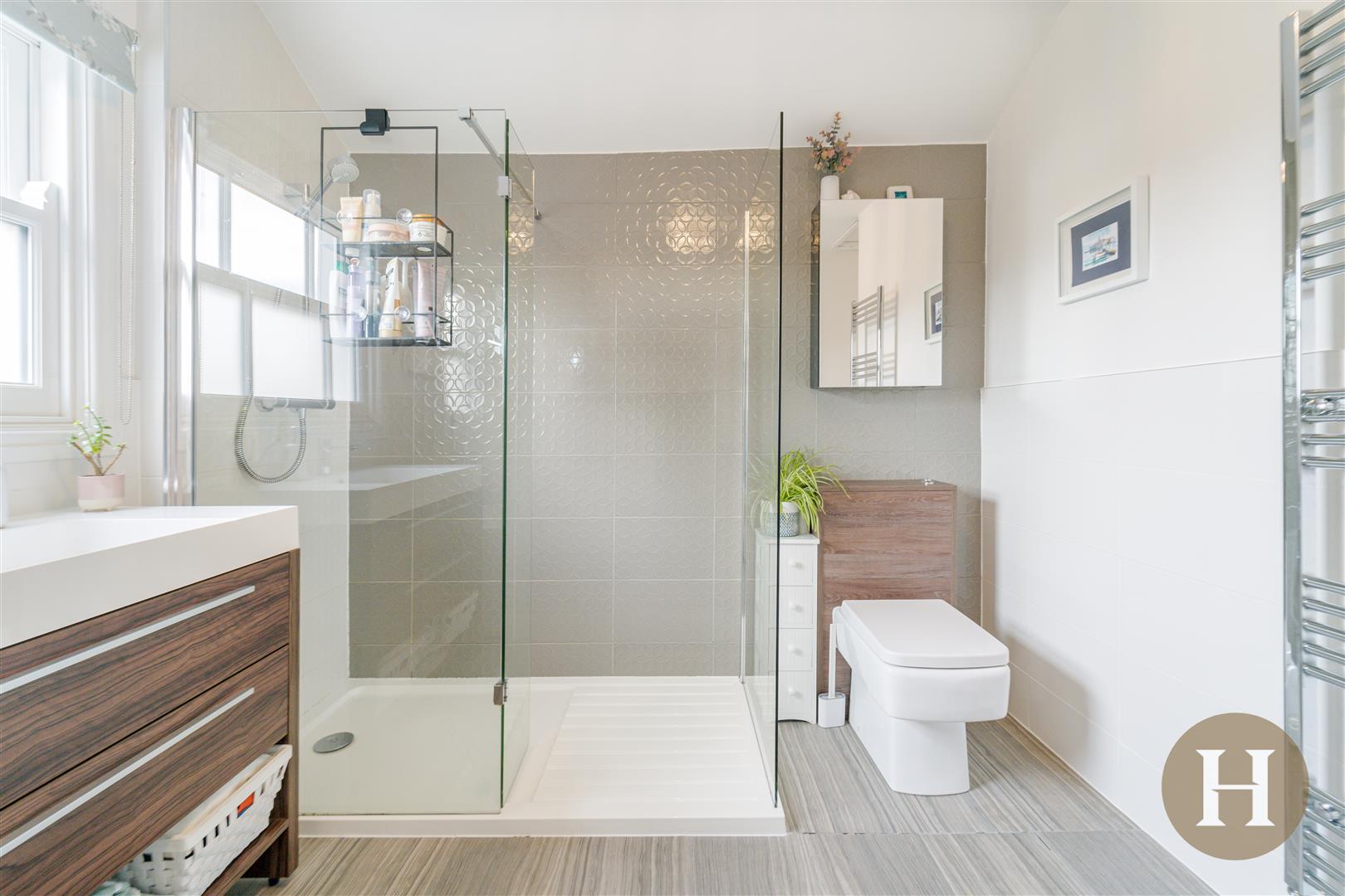 Bathroom - Stylish family bathroom boasting freestanding bath and separate walk in shower. Partially tiled, with low level flush WC, vanity unit, radiator and towel radiator. Opaque glazed sash window to the rear elevation and ceiling light point.