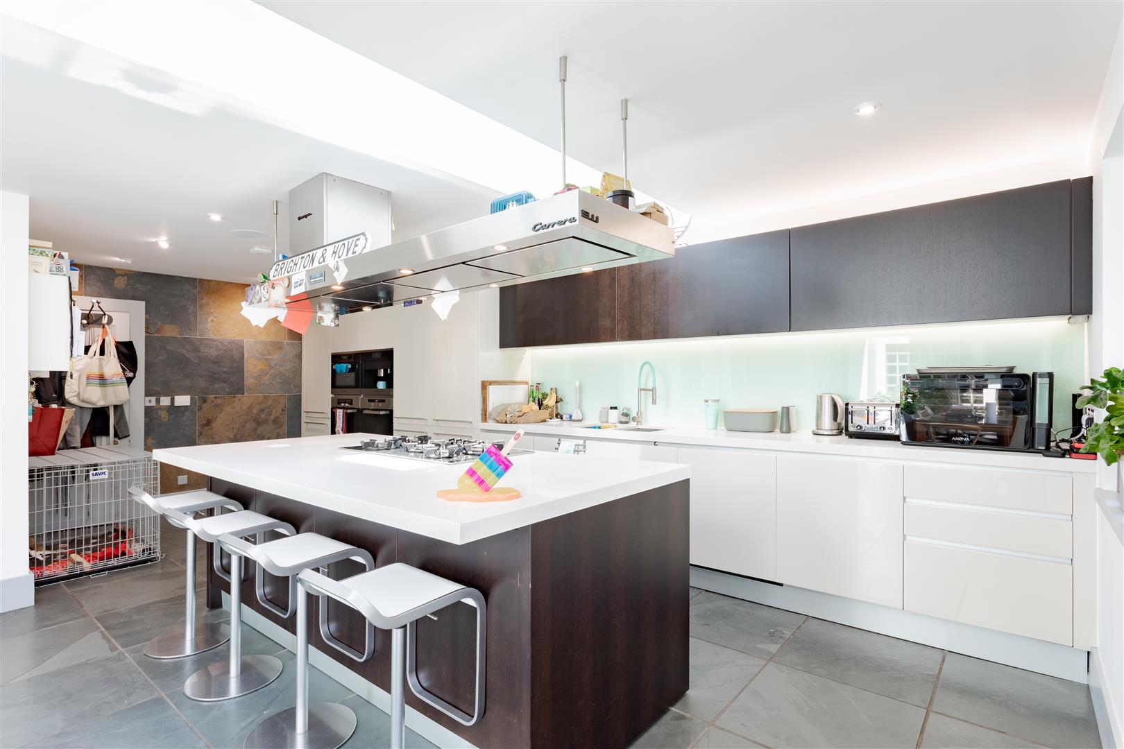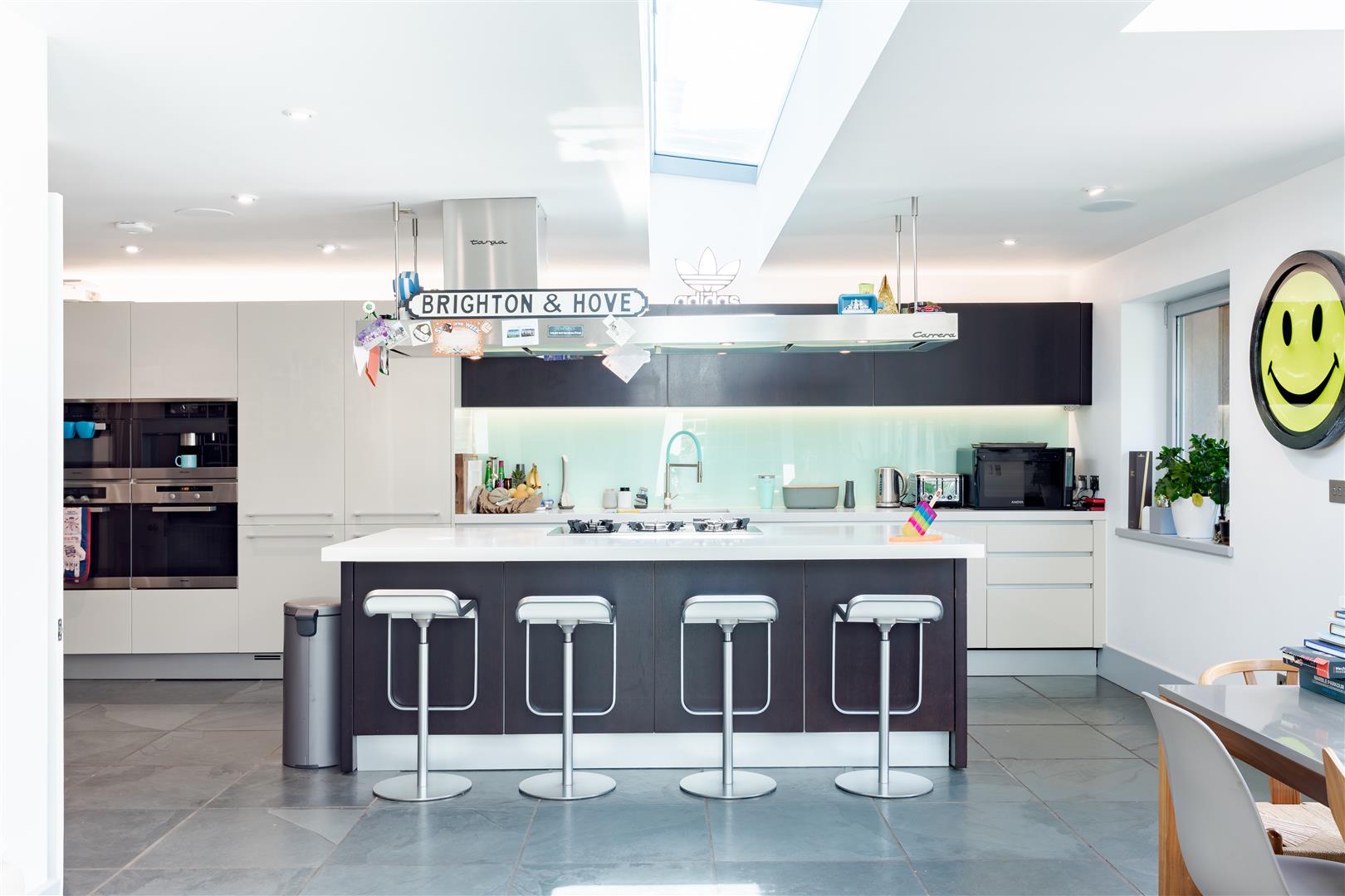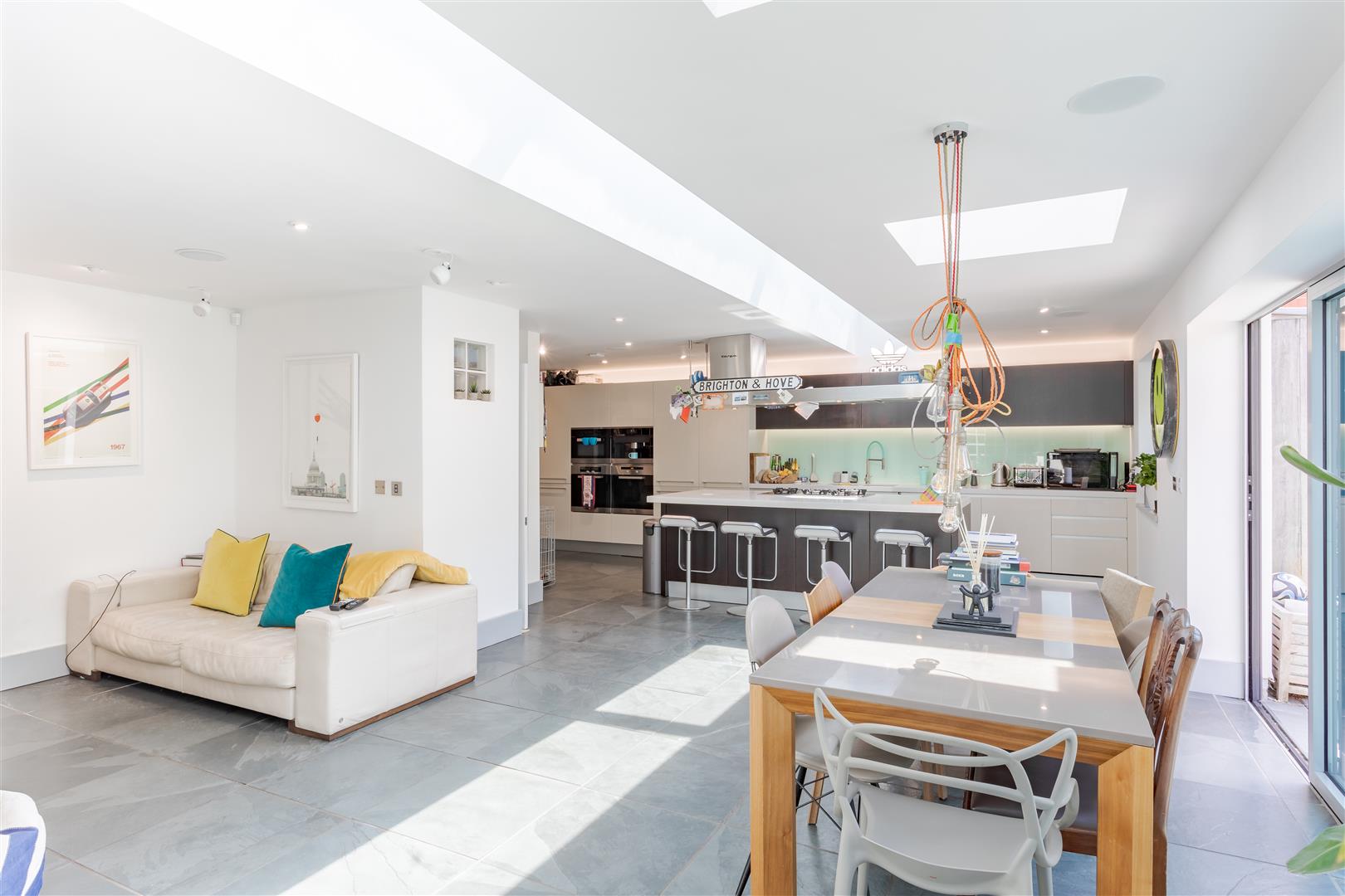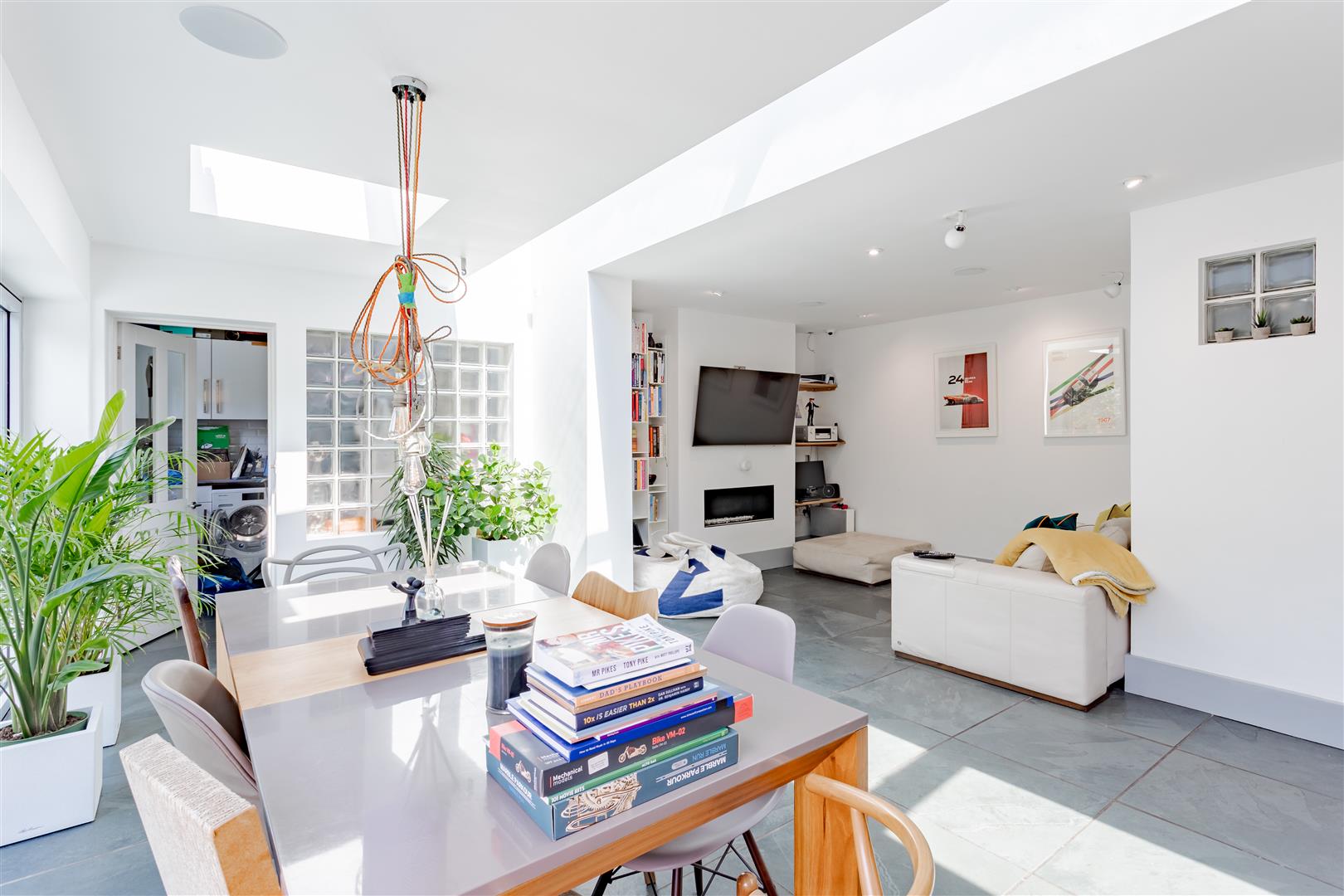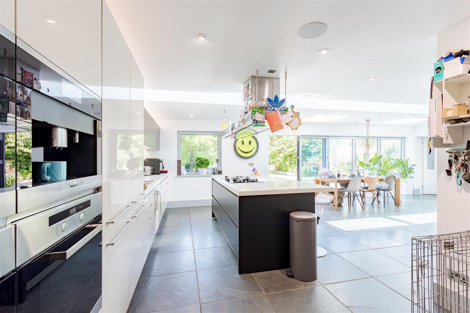 Kitchen - Modern open plan kitchen area with underfloor heating throughout with built in Miele appliances such as: two ovens, microwave oven, coffee machine, double fridge freezer and five burner gas hob which will all be included with the sale. Not to mention the sky lights and bifolding doors into the garden offering a vast amount of natural light. Porcelanosa tiles throughout the kitchen creating a beautiful feature wall when entering the kitchen through the dining room.