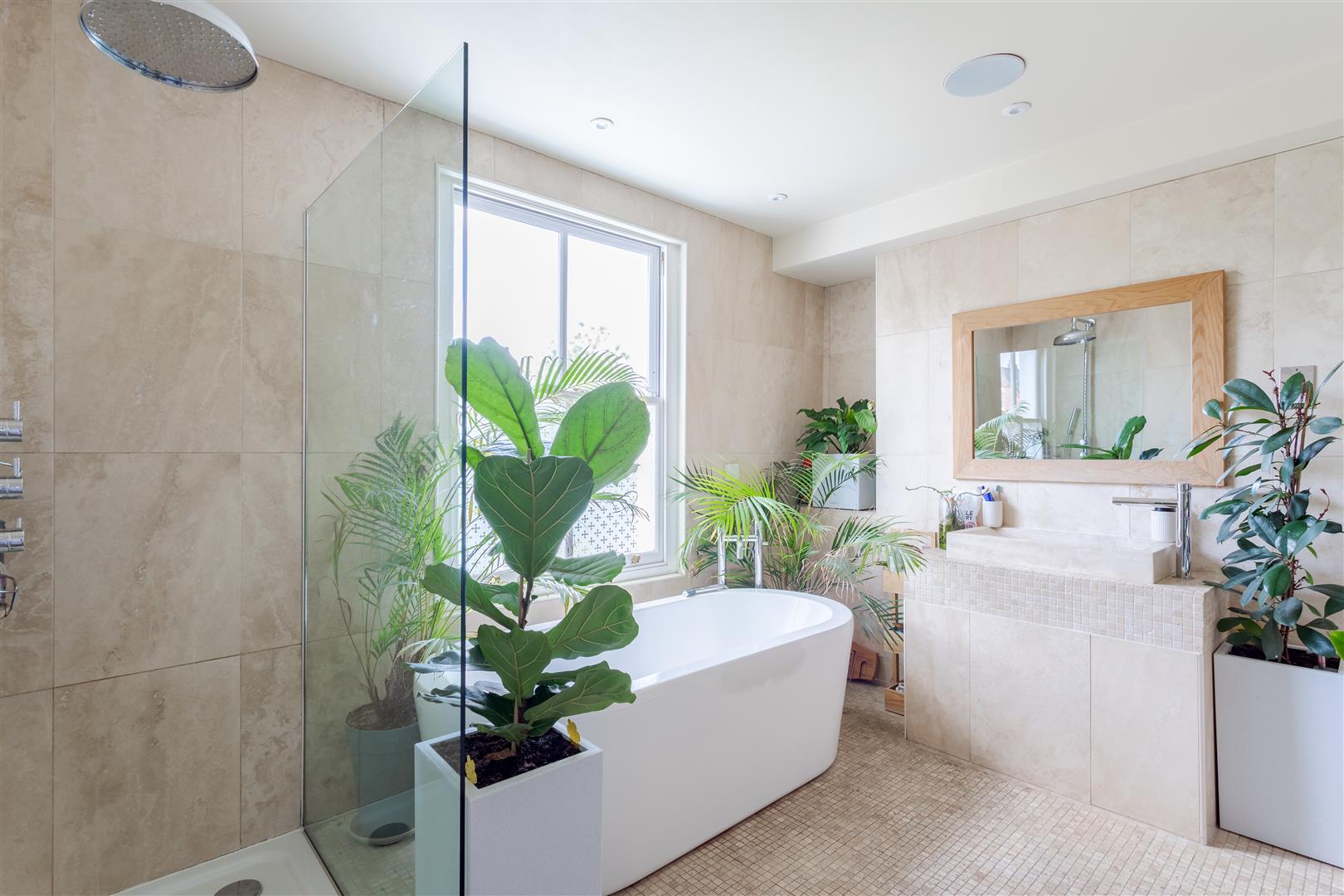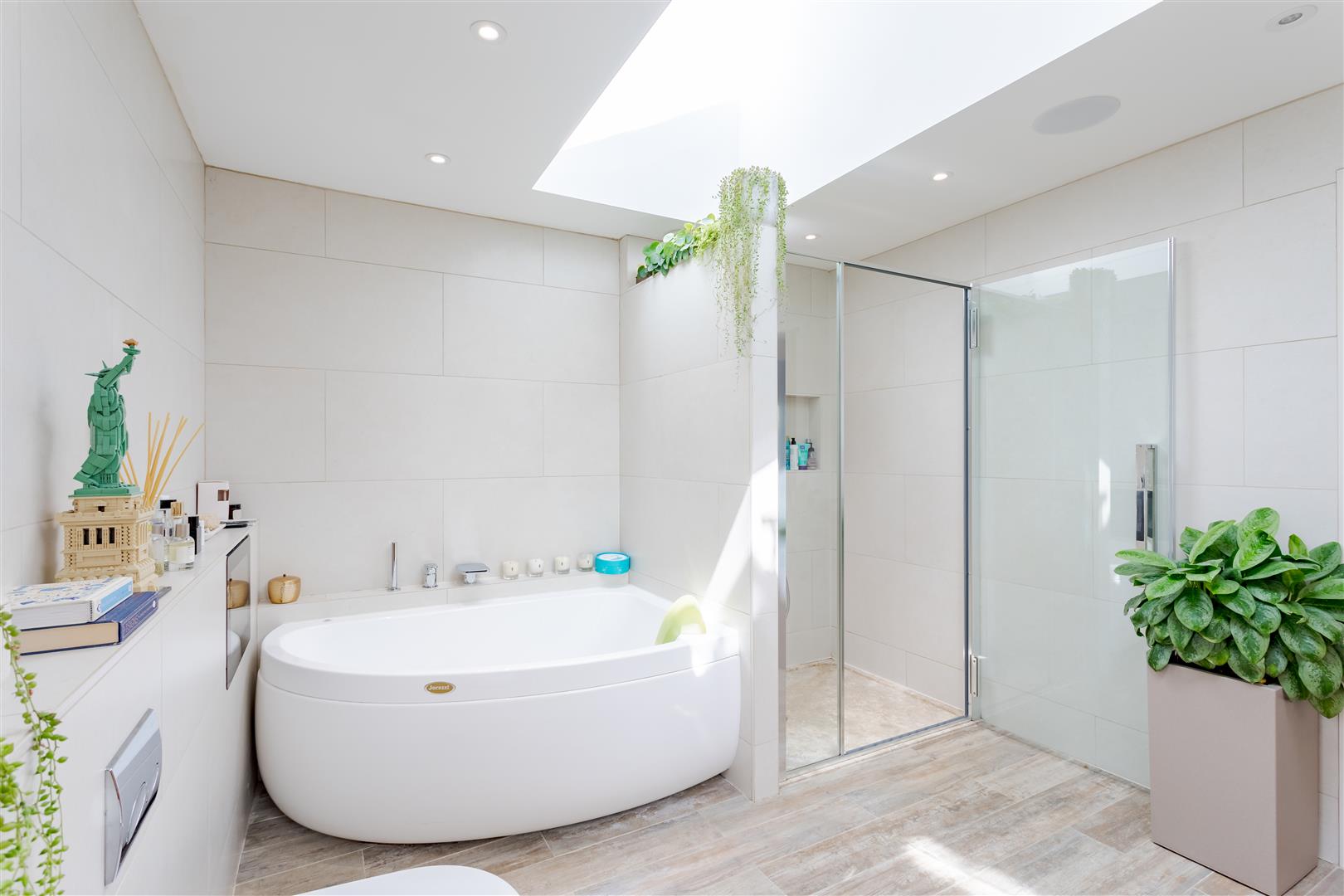 Master Bedroom En-Suite - Laminate wood flooring, tiled walls, obscure sash window to rear, skylight, ceiling spotlight points, heated towel rail, walk in shower cubicle, corner bath, low flush W.C and two hand wash basins.