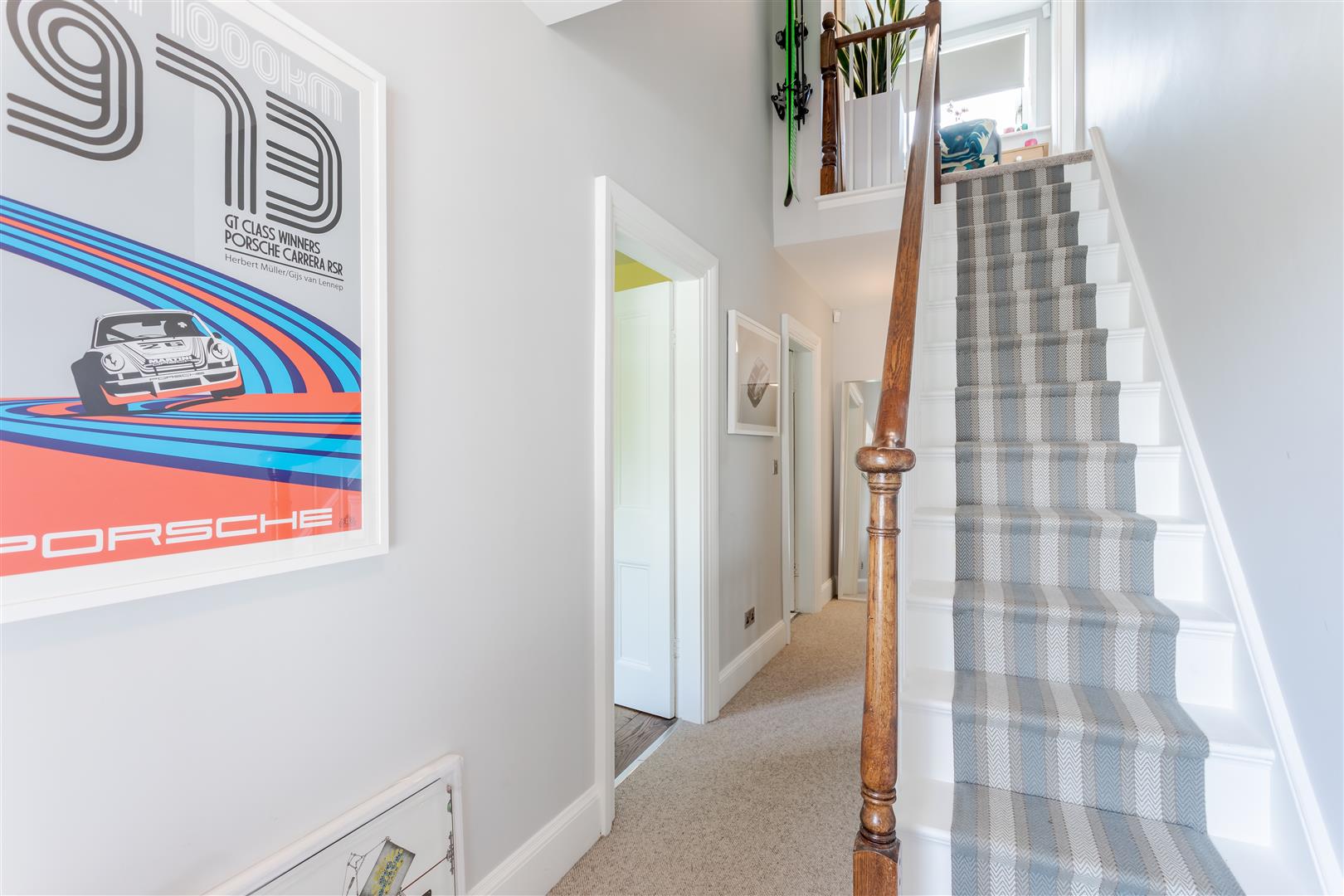 Entrance Hall - Herringbone wood flooring, ceiling spotlight points, radiator and original stained glass door to front.