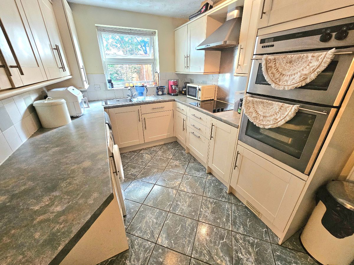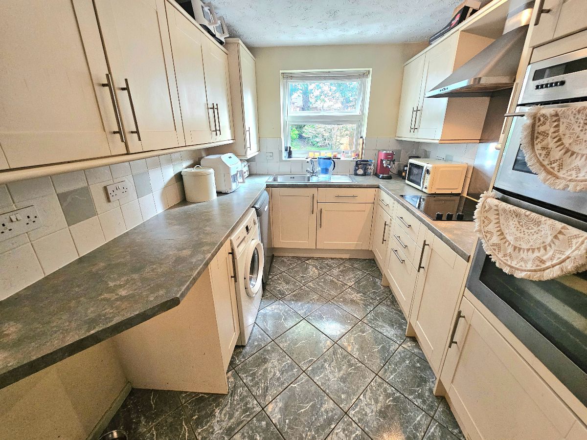 Wall and base units with inset sink & drainer, electric oven and hob, space for washing machine and fridge freezer, rear aspect double glazed window and door to hallway.