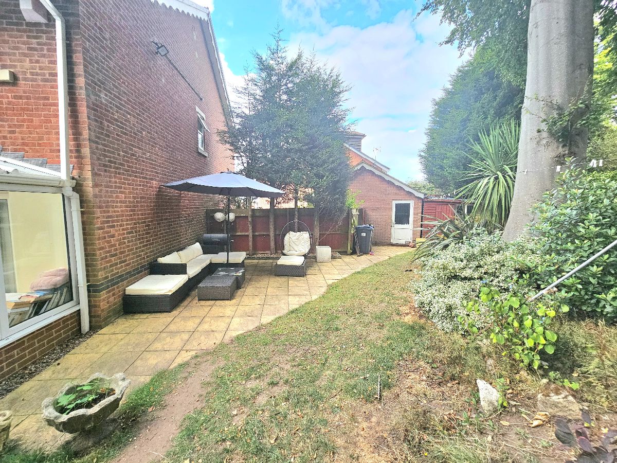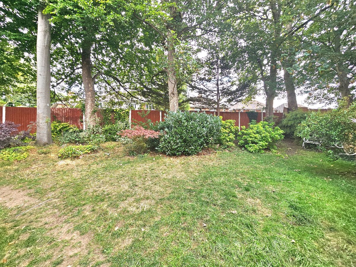 The property occupies a generous corner plot with patio area to the rear and side with lawn and mature trees and shrub borders, side fence with gate leading to property frontage and access to garage.