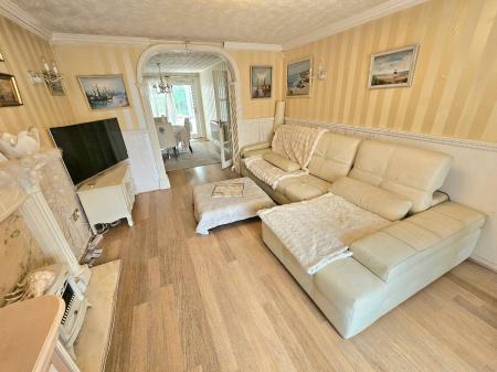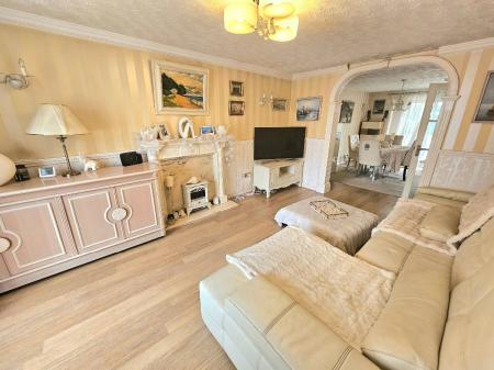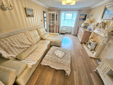 Front aspect double glazed bay window, radiator, feature fire surround, laminate wood flooring and opening into dining room.
