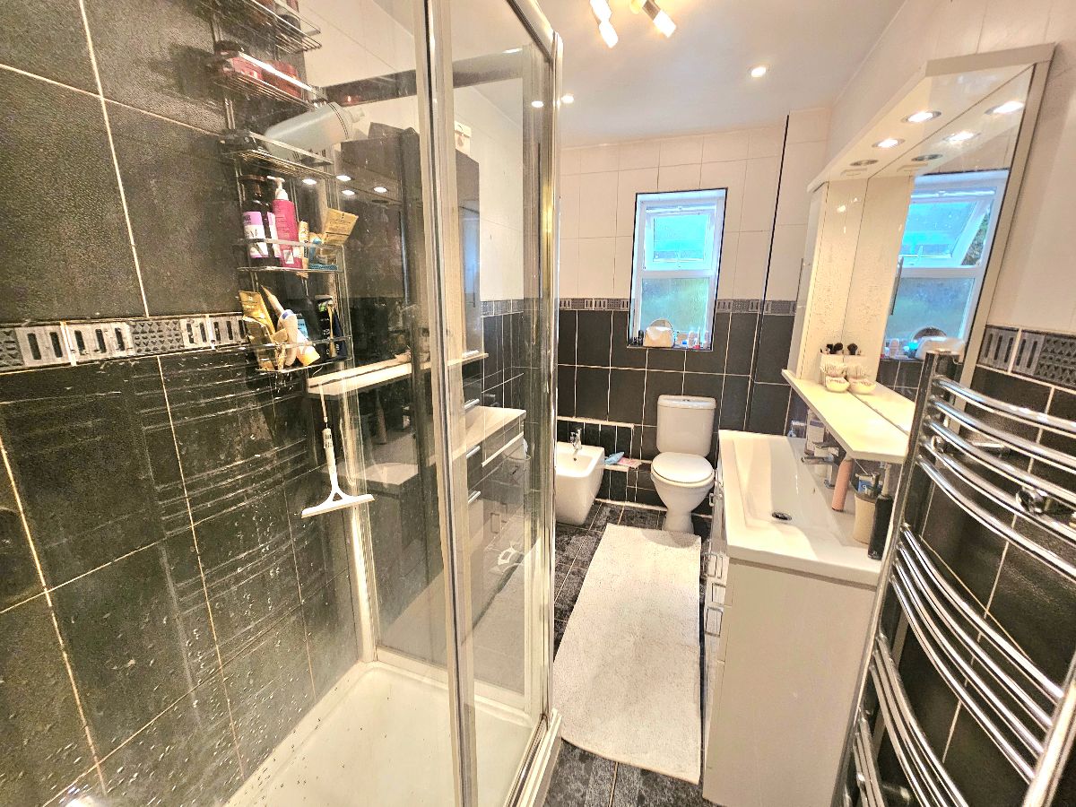 Having double walk in shower cubicle with shower over, vanity unit with storage and wash hand basin, low level Wc, bidet, tiled walls and flooring, heated towel rail and spotlights to ceiling.