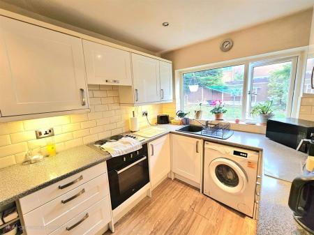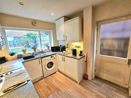 Wall & base units with inset sink & drainer, electric hob and oven, space for washing machine and fridge freezer, part tiled walls and door to garden.