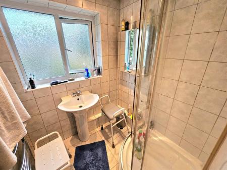 Walk in shower cubicle with Triton electric shower over, wash hand basin and low level wc, rear aspect double glazed window.