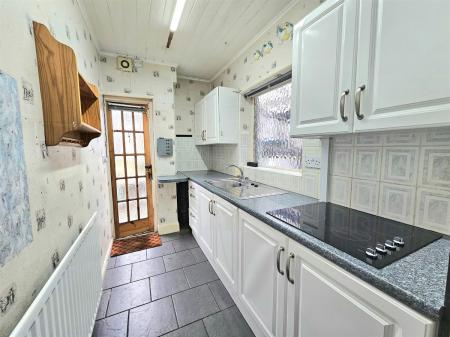 Matching range of wall and base units with wooden working surfaces, inset stainless steel sink and drainer, electric hob and oven, space for washing machine and fridge freezer, side aspect window and door to garden.