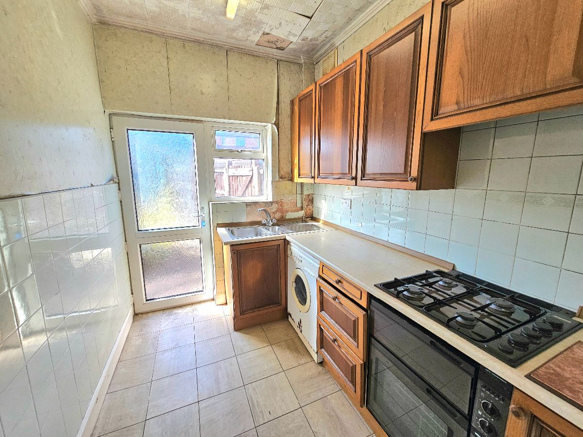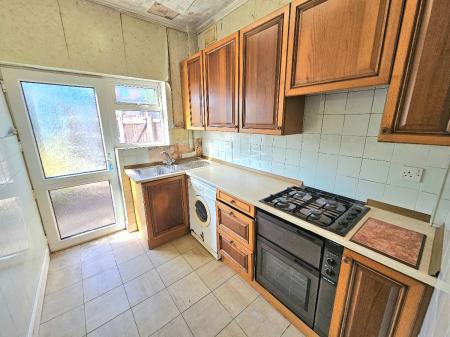 Basic range of wall & base units, inset sink & drainer, space for cooker and washing machine, rear aspect window.