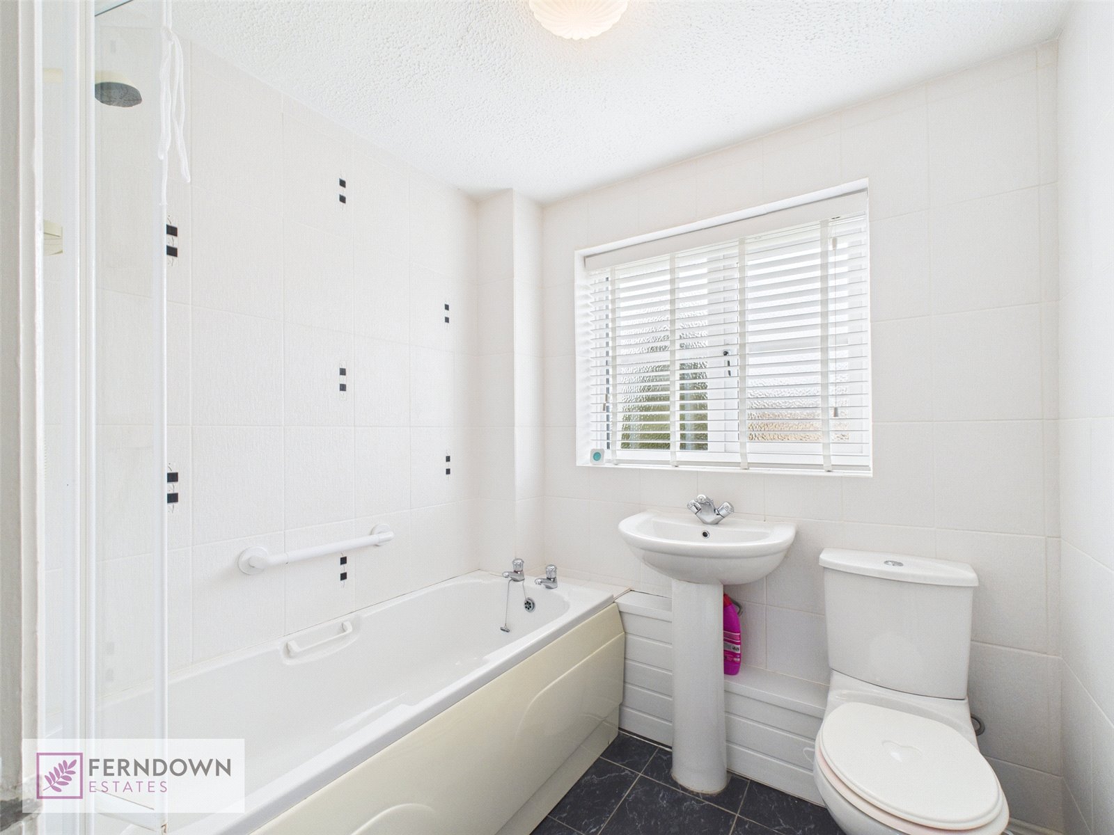 To include a panelled bath with shower over, low level wc and a pedestal wash hand basin