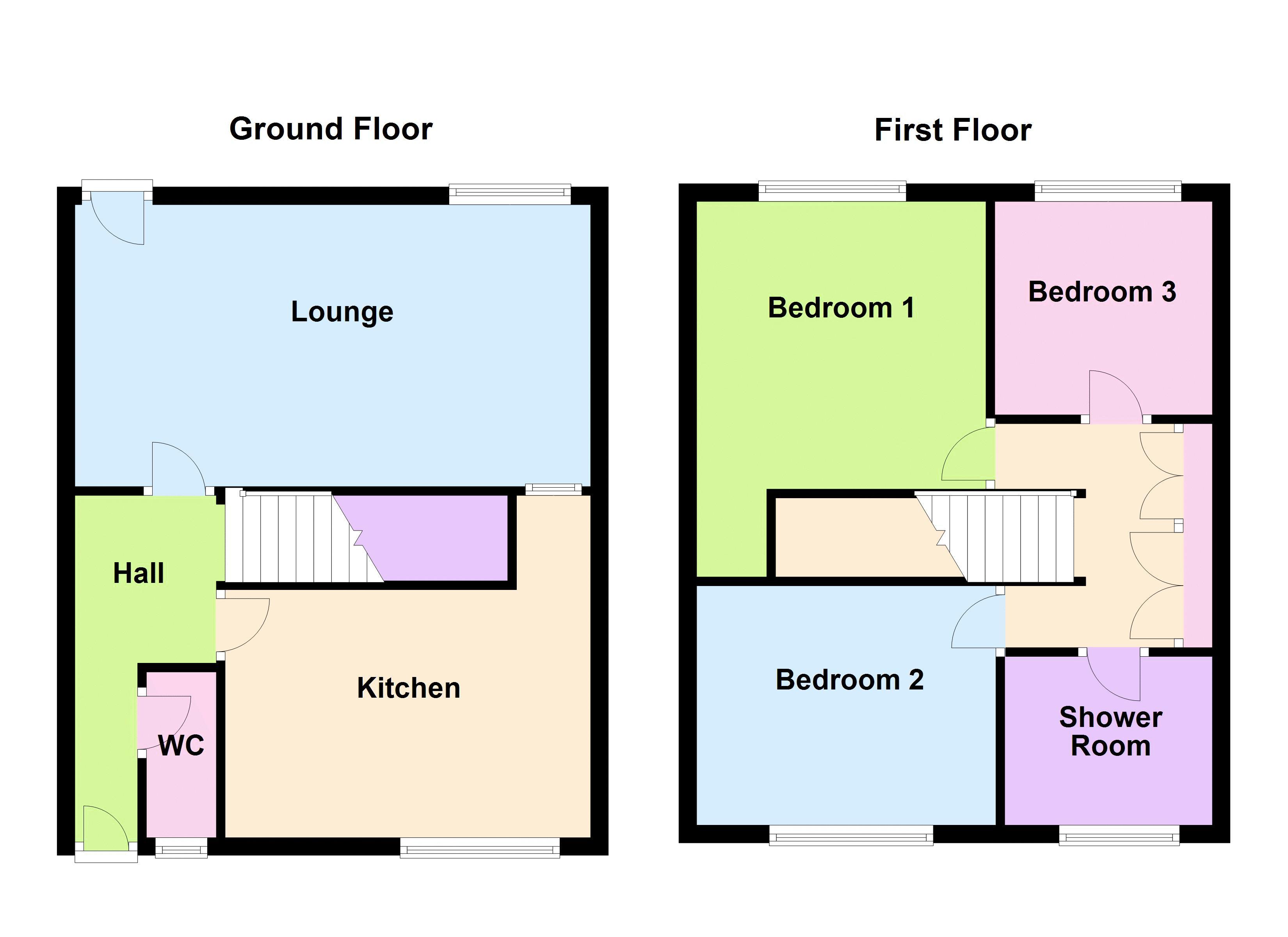 Staircase leads to Landing with access to Bedroom One (front) 3.6m x 3m, Bedroom Two (rear) 3.6m x 3m, Bedroom Three (rear) 2.3m x 2.4m, Shower Room.