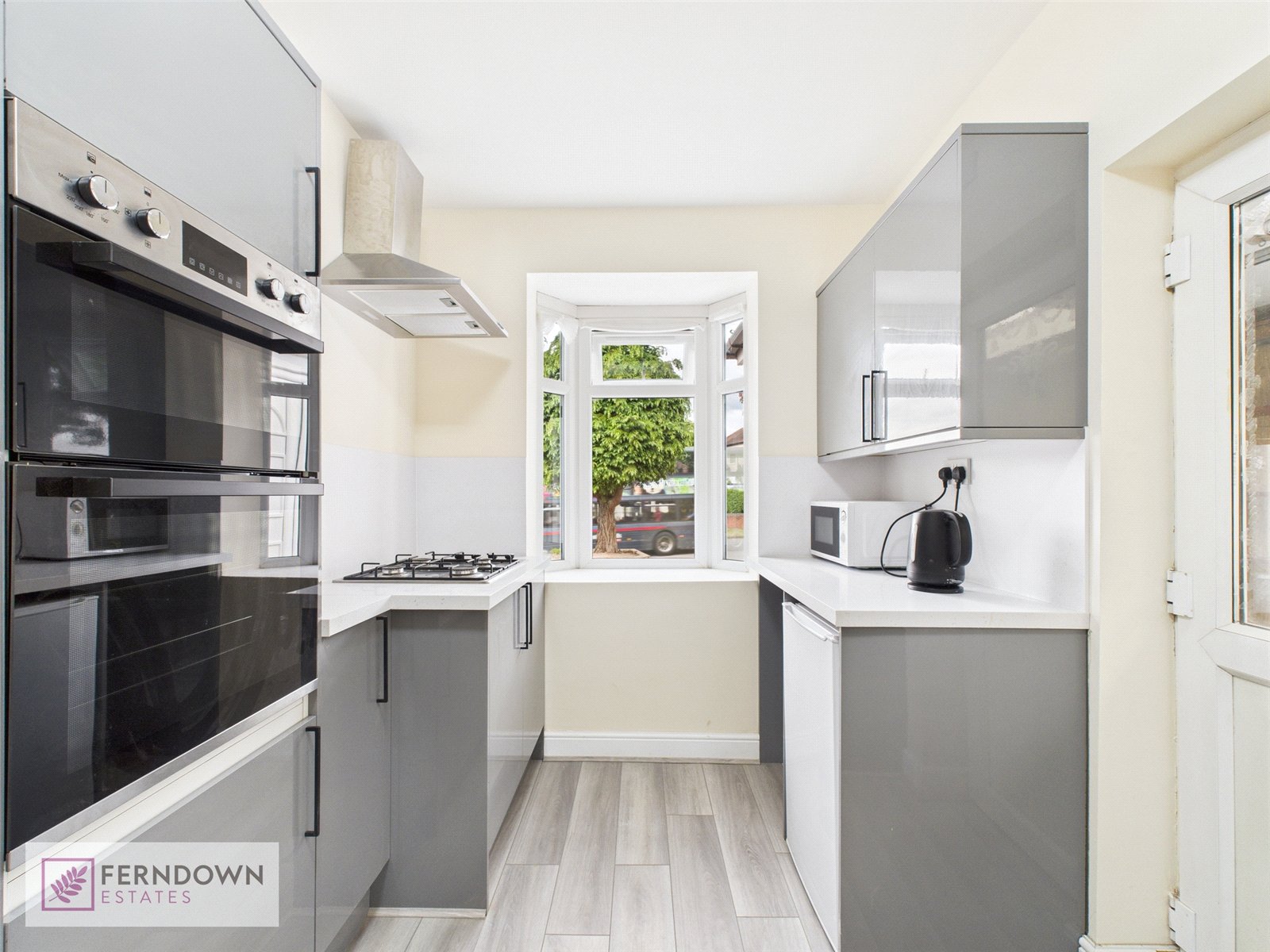 Kitchen Overlooking the front of the property with a door leading out.