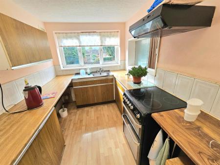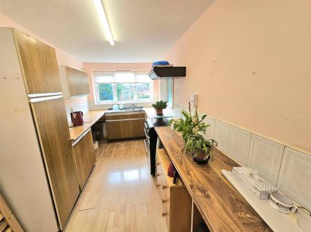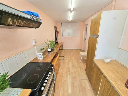 Rear aspect double glazed window, wall & base units with inset sink & drainer, space for cooker and washing machine, laminate wood flooring built in storage cupboard and side doors to side lobby.