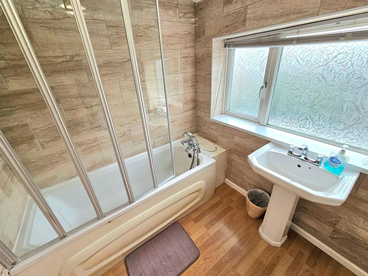 Modern bathroom having panel bath with Triton electric shower over and mixer taps, pedestal wash hand basin and rear aspect double glazed window.