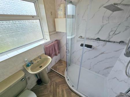 Having walk in shower cubicle with Triton electric shower over, radiator, wash hand basin and low level WC, rear aspect double glazed window and vinyl flooring.