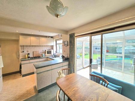 Dining room area having door to conservatory and radiator and leading through to kitchen area having rear aspect double glazed window, wall and base units, separate oven and four ring gas hob, inset stainless steel sink and drainer, vinyl flooring and door to utility room.