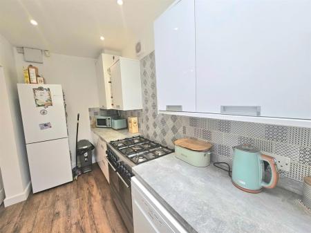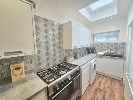 Modern range of wall and base units with inset sink and drainer, space for double oven, integrated dishwasher and space and plumbing for washing machine, tumble dryer and space for fridge freezer. Sky light and rear aspect double glazed window.