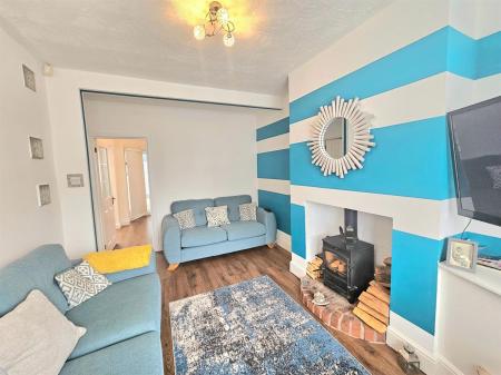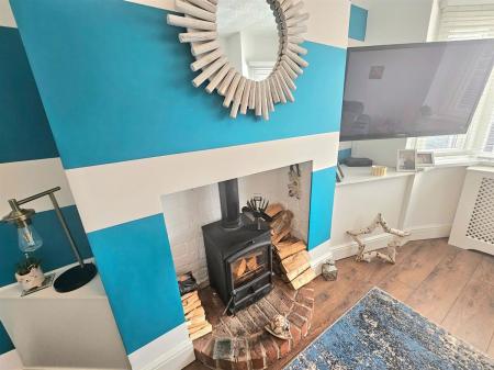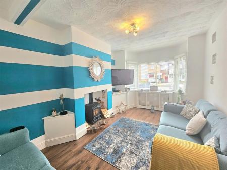 Modern spacious lounge with front aspect double glazed bay window, radiator, feature fire surround with log burner, laminate wood flooring and door into dining room.