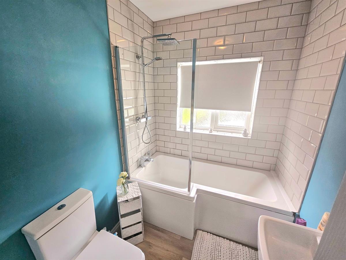 Modern family bathroom with P shaped bath having power shower over, wash hand basin, low level WC, tiling to splash prone areas and vinyl wood effect flooring.