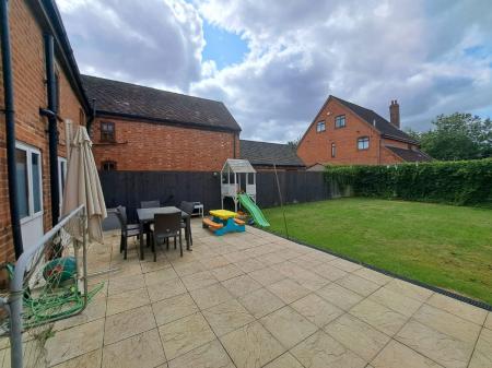 the rear garden having paved patio area with lawn beyond and being bound within by timber fencing and hedged borders.