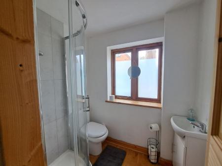 Fitted with a corner shower cubicle, w.c., wash hand basin, splashback tiling, ceiling light point, obscure double glazed to the rear aspect and wood effect flooring.