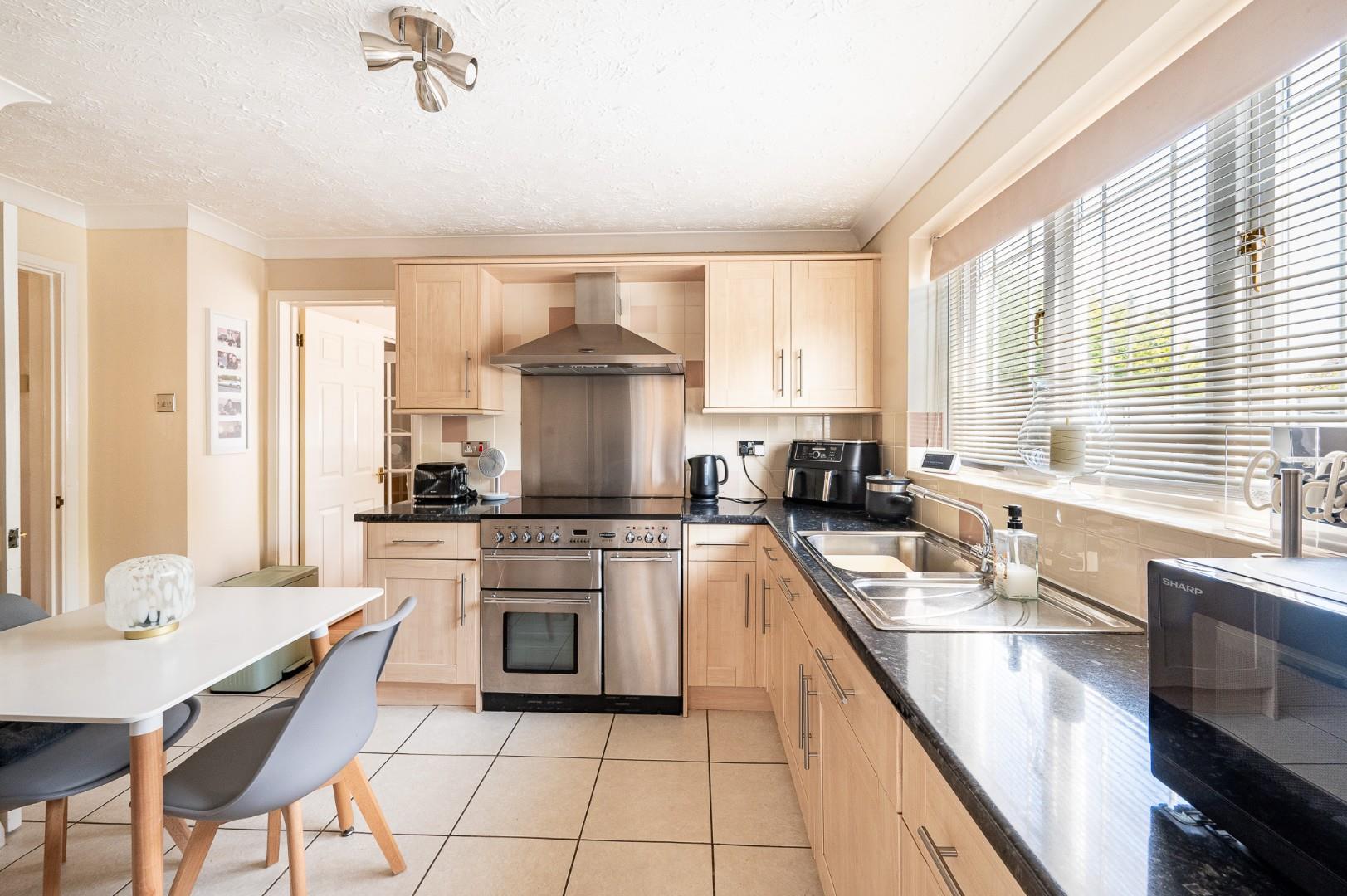 Kitchen/Breakfast Room - 3.84m x 3.25m (12'7" x 10'8") - Double glazed window to rear aspect, base and eye level units with complimentary working surfaces over, inset sink with drainer unit, integrated dishwasher, space for Rangemaster cooker with extractor over, space for American style fridge/freezer, part tiled walls, tiled flooring, power points, door to.