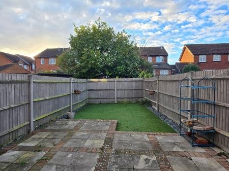 Large paved patio area and area of artificial lawn. Enclosed by panelled fencing. Access gate. Door to recessed bin store.