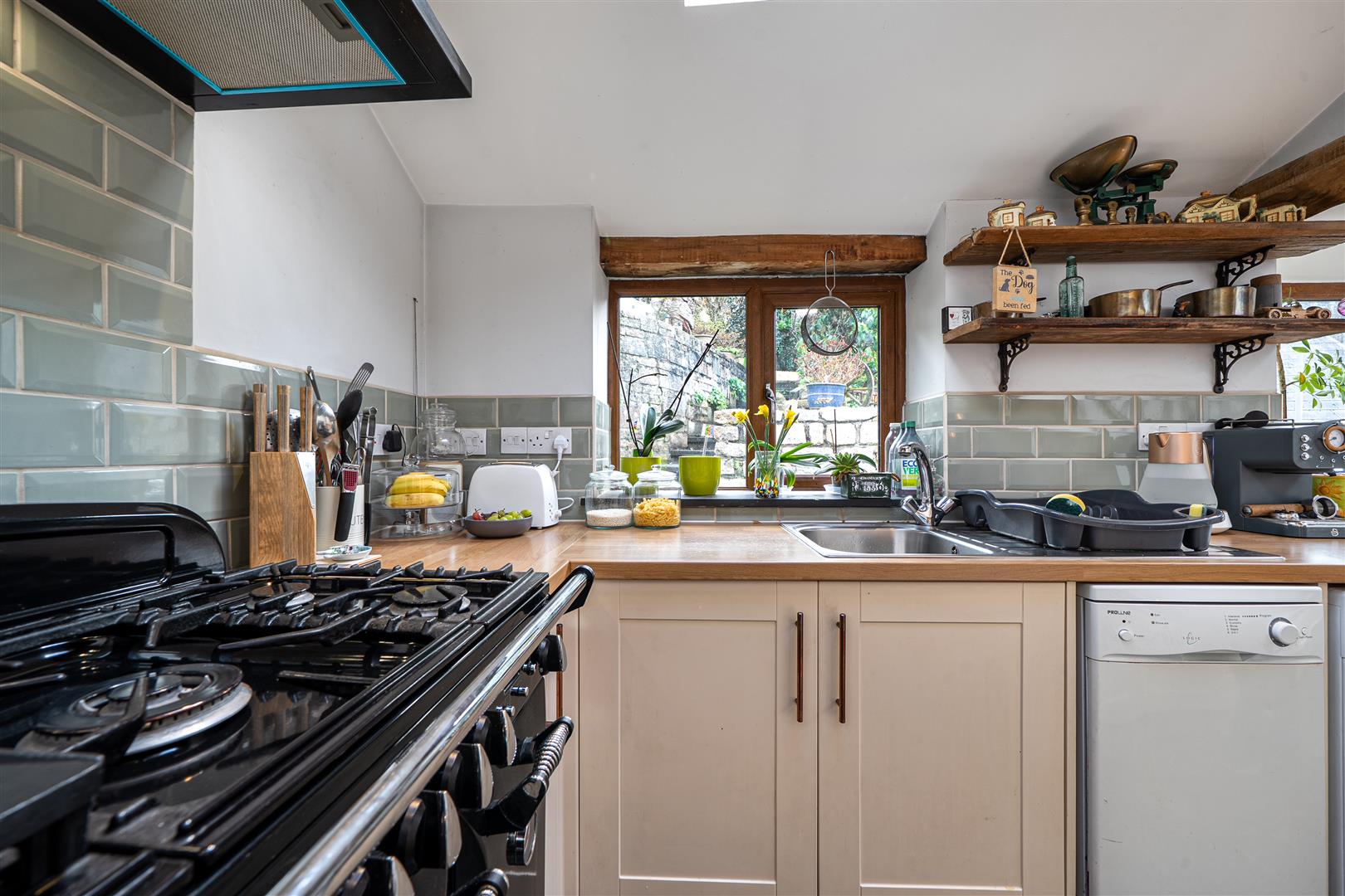 A functional storm porch welcomes you into the countrified sitting room made cosy by the glow of its log burner. The dining room at the rear is currently used as a snug and our vendors tell us that in the cottage's original deeds, this was a former chapel. From here, the galley kitchen, bathed in natural light from sky-lights and 2 large picture windows, showcases a wealth of storage beneath farmhouse shaker-style units, again adding to the rustic cottage feel.