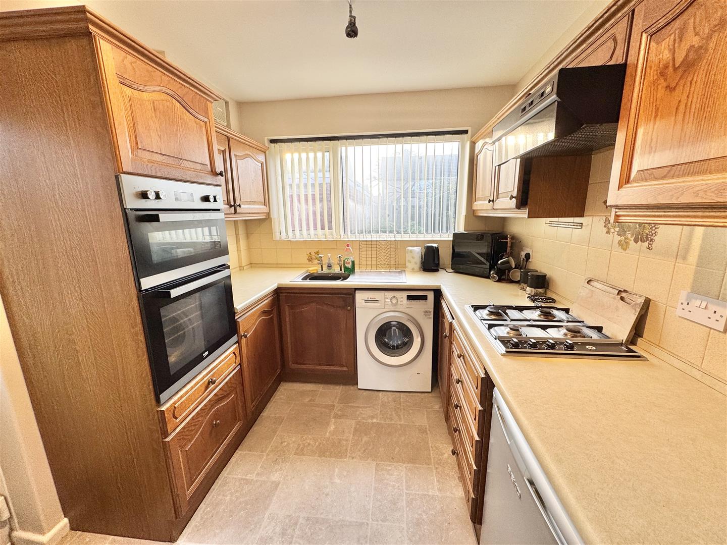 Back through the hallway, the kitchen breakfast room is well-designed, offering space for a dining table and plenty of fitted wall and base units. It features a sink and drainer, a oven, a hob with an extractor fan, plumbing for a washing machine, and space for a fridge. A side door provides easy access to the exterior of the property.