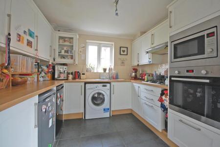 Double glazed window to front, range of matching wall and base units with edged work surfaces and tiled splashbacks incorporating a stainless steel single sink / drainer unit, built-in single oven, built-in microwave, gas hob with extractor hood over, space for fridge/freezer, dishwasher and washing machine, wall mounted boiler in cupboard, radiator, tiled flooring and smooth coved ceiling. Door to side.