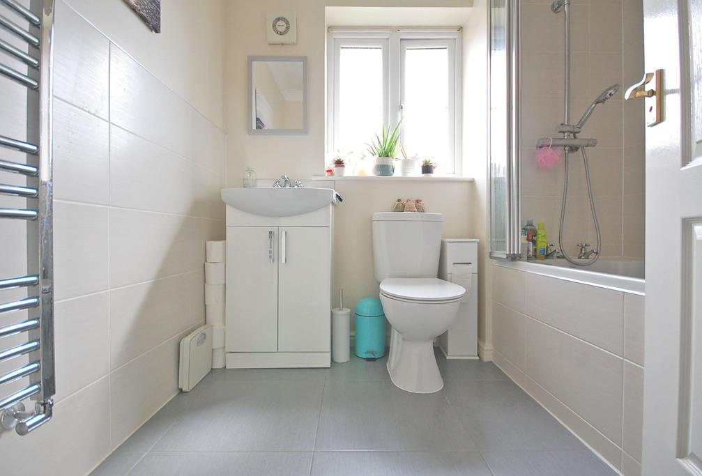 Opaque double glazed window to side, panelled bath, with shower over, low level WC, vanity wash hand basin with tiled splashbacks, extractor fan, radiator, tiled flooring and smooth coved ceiling.
