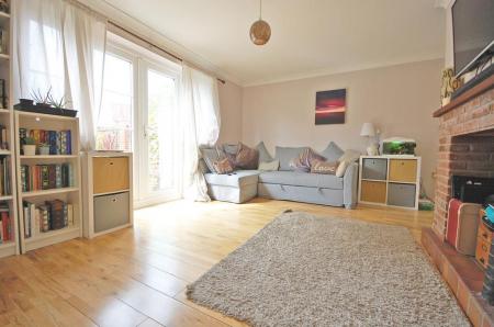 Feature brick fireplace with tiled hearth, radiator, engineered oak flooring and smooth coved ceiling. French doors onto rear garden.