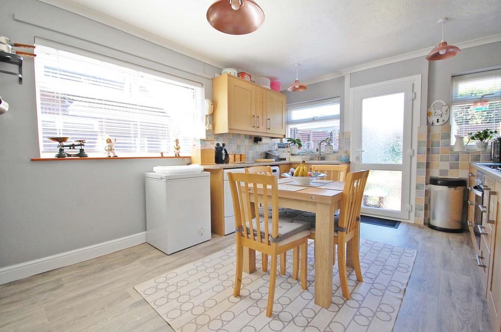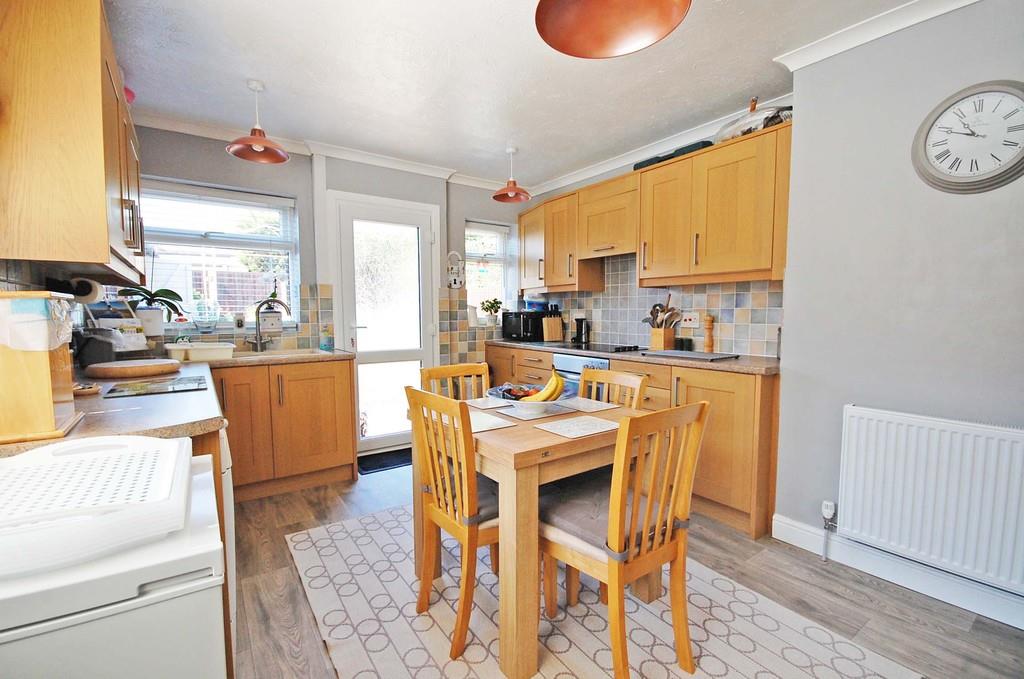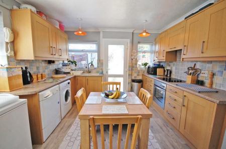 Double glazed windows to side and rear aspects, matching wall and base units with roll top work surfaces one and a half bowl sink and drainer with central mixer taps, built-in oven, electric hob with extractor hood, space for fridge/freezer, washing machine and tumble dryer, radiator, vinyl flooring, textured ceiling, double glazed door to rear garden.