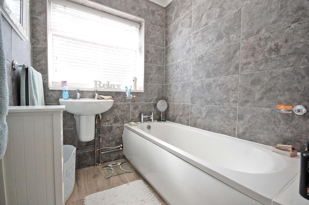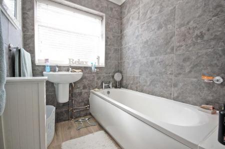 Double glazed opaque window to side aspect, panelled bath with central mixer taps, pedestal wash hand basin, heated towel rail, vinyl flooring, textured ceiling.