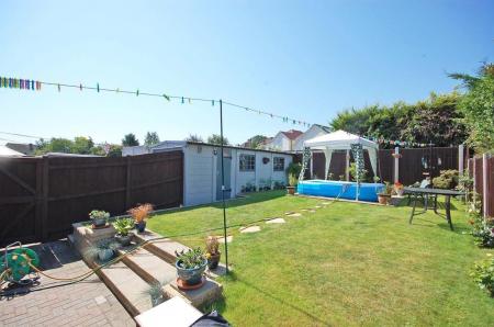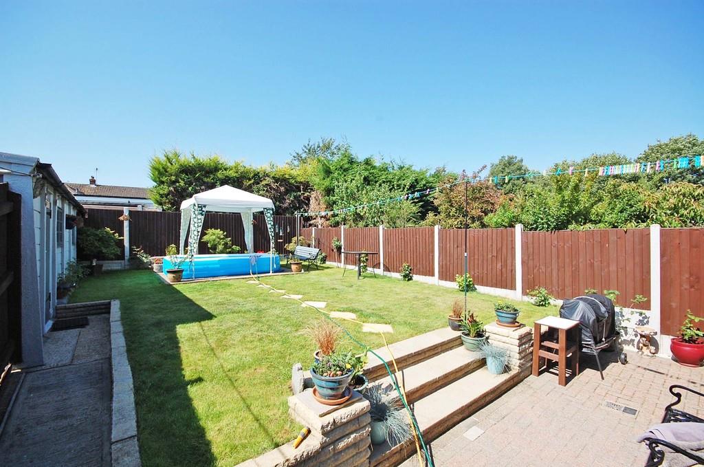 Enclosed rear garden mainly laid to lawn with hardstanding patio area, side access to garage/workshop, side access via gate leading onto driveway.