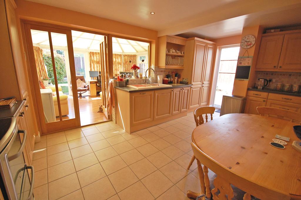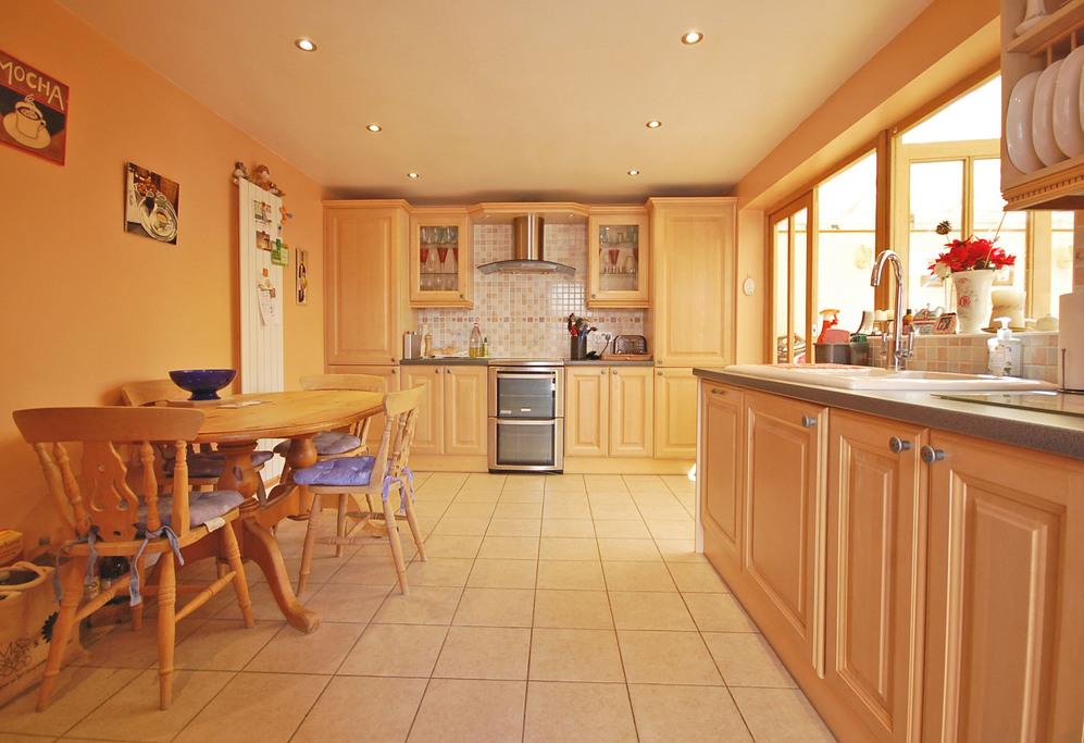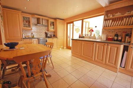 Double glazed window to rear aspect, a series of matching base and wall units, with roll top work surfaces incorporating one and a half ceramic sink with central mixer tap and drainer, cooker with extractor hood over, integrated fridge/freezer and dishwasher, space for washing machine, radiator, tiled flooring and smooth ceiling with sunken spotlights. Door to conservatory and opaque part-glazed door to side aspect.