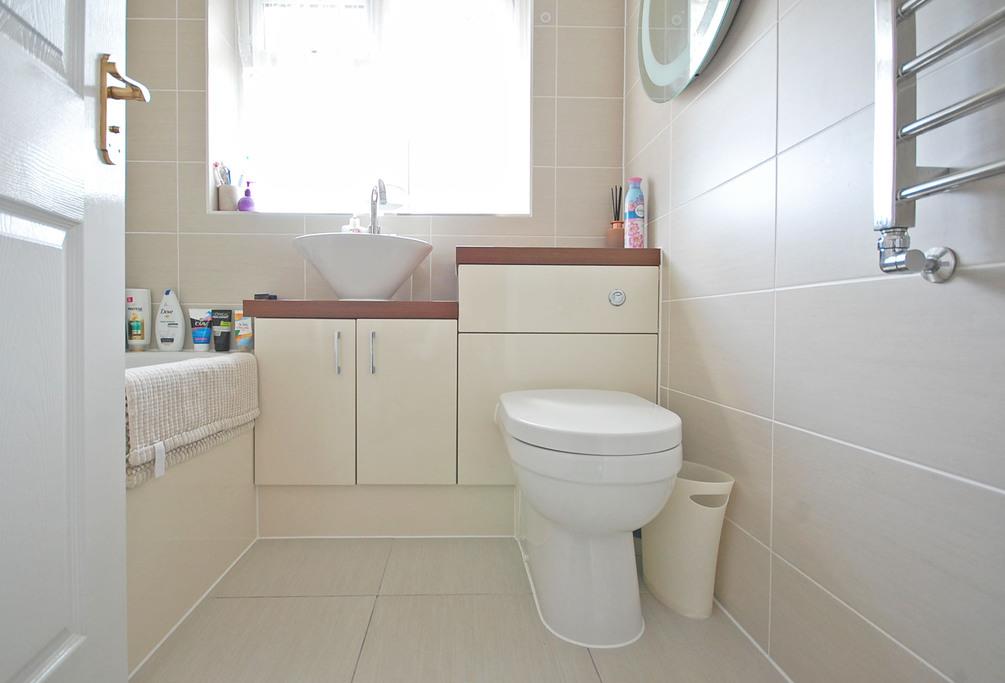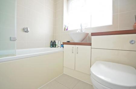 Opaque double glazed window to rear aspect, panelled bath with inset tap and shower over, inset WC, vanity wash hand basin with fitted storage units, heated towel rail, extractor fan, tiled flooring and smooth ceiling with sunken spotlights.