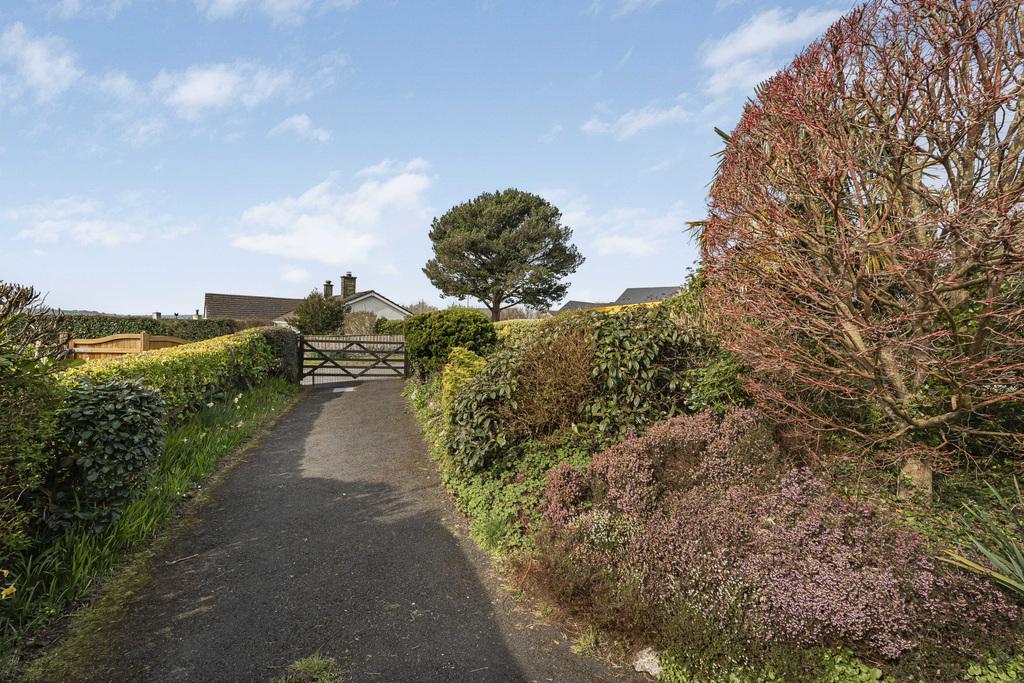 - Gardens wrap around the property with paved terrace, greenhouse, and shed