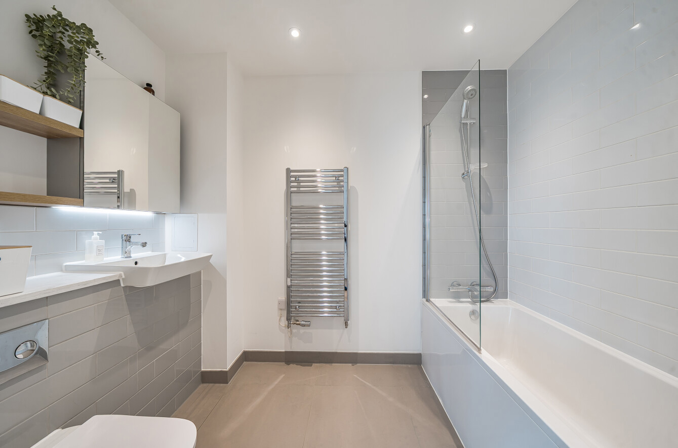 The light and spacious bedroom, benefits from fitted wardrobes and the bathroom has a white suite including shower over the bath, built in basin, storage above the basin and heated towel rail.