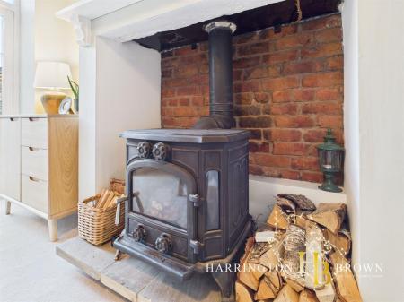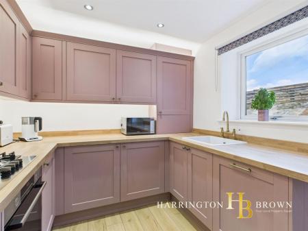 To the front, the lounge is bathed in morning light through the bay window, enhanced by high ceilings, original coving and an elegant feel. There is also a gas fire feature. To the rear, the dining room is equally impressive, featuring a brick inglenook fireplace with a log burner, a ceiling rose, coving, French doors to the courtyard, and a large understairs cupboard. The dining room connects seamlessly to the recently installed kitchen (December 2024), fitted with pastel pink cabinetry, a ceramic sink with gold fittings, and integrated appliances including oven, gas hob, and dishwasher. Spotlights brighten the space, while a discreet cupboard houses the combi boiler. From here, an external door opens to the stone-paved rear yard with log store, and direct access into the garage.