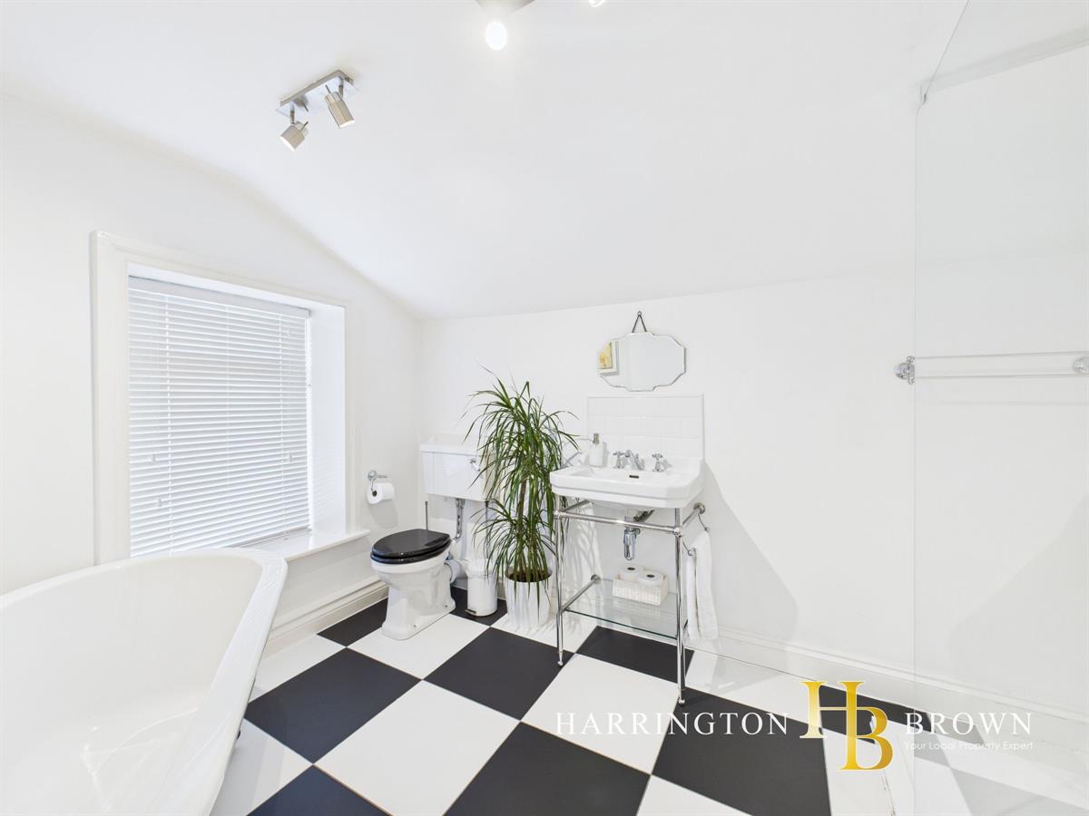 Upstairs, the split-level landing first leads to the striking family bathroom, styled in monochrome tiling and fitted with a freestanding bath, walk-in rainfall shower, and traditional suite. Beyond, three bedrooms await: a generous double to the rear with countryside views framed by built-in shelving, and two further rooms to the front with a pleasant outlook across the green space opposite.