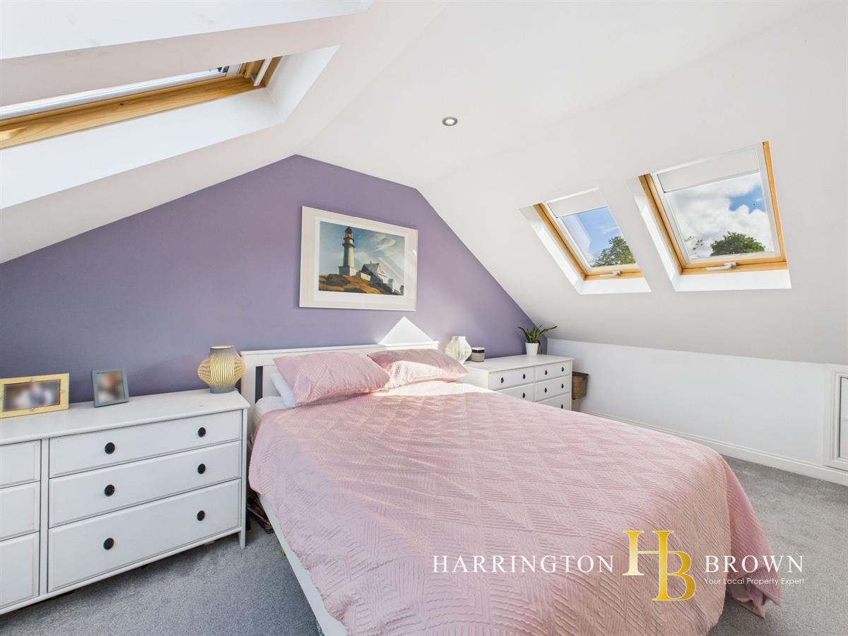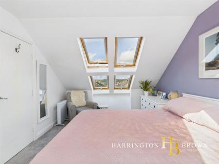 The upper floor is dedicated to the master suite, a wonderfully bright and airy retreat with six tilt-and-turn windows capturing views towards Northumberland. The room also benefits from eaves storage and a stylish ensuite with statement tiling, toilet, and basin.