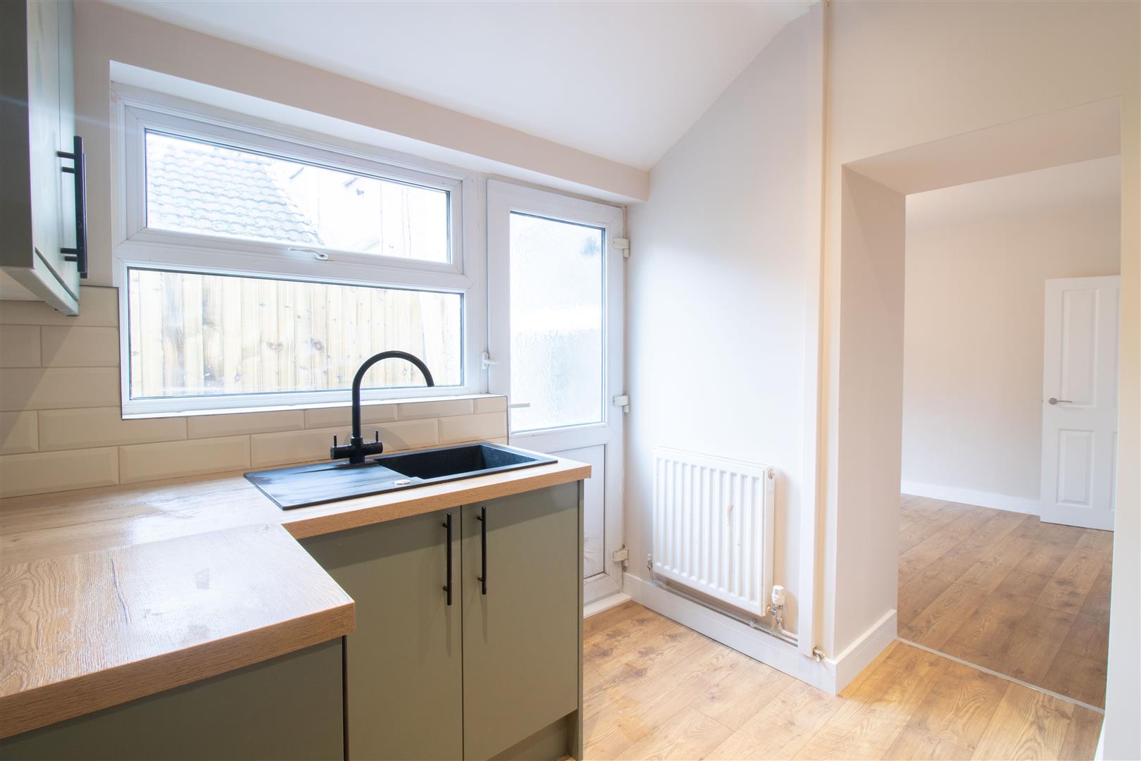 Kitchen - 2.98 x 2.38 (9'9" x 7'9") - UPVC double glazed window and door to side, new fitted matching base and wall units, roll edge worktop, composite sink with drainer and mixer tap, integrated electric oven, hob and fridge/freezer, tile splash back, plastered walls and ceiling, laminate floor, radiator, power points.