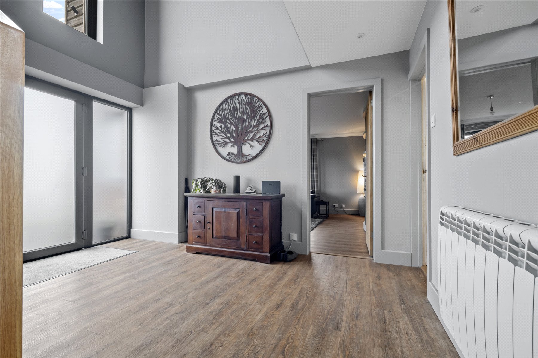 The ENTRANCE HALLWAY is bathed in natural light, thanks to the impressive two-storey floor-to-ceiling windows that provide an immediate connection to the picturesque outdoors. High-specification Camaro flooring runs throughout the majority of the ground floor rooms.