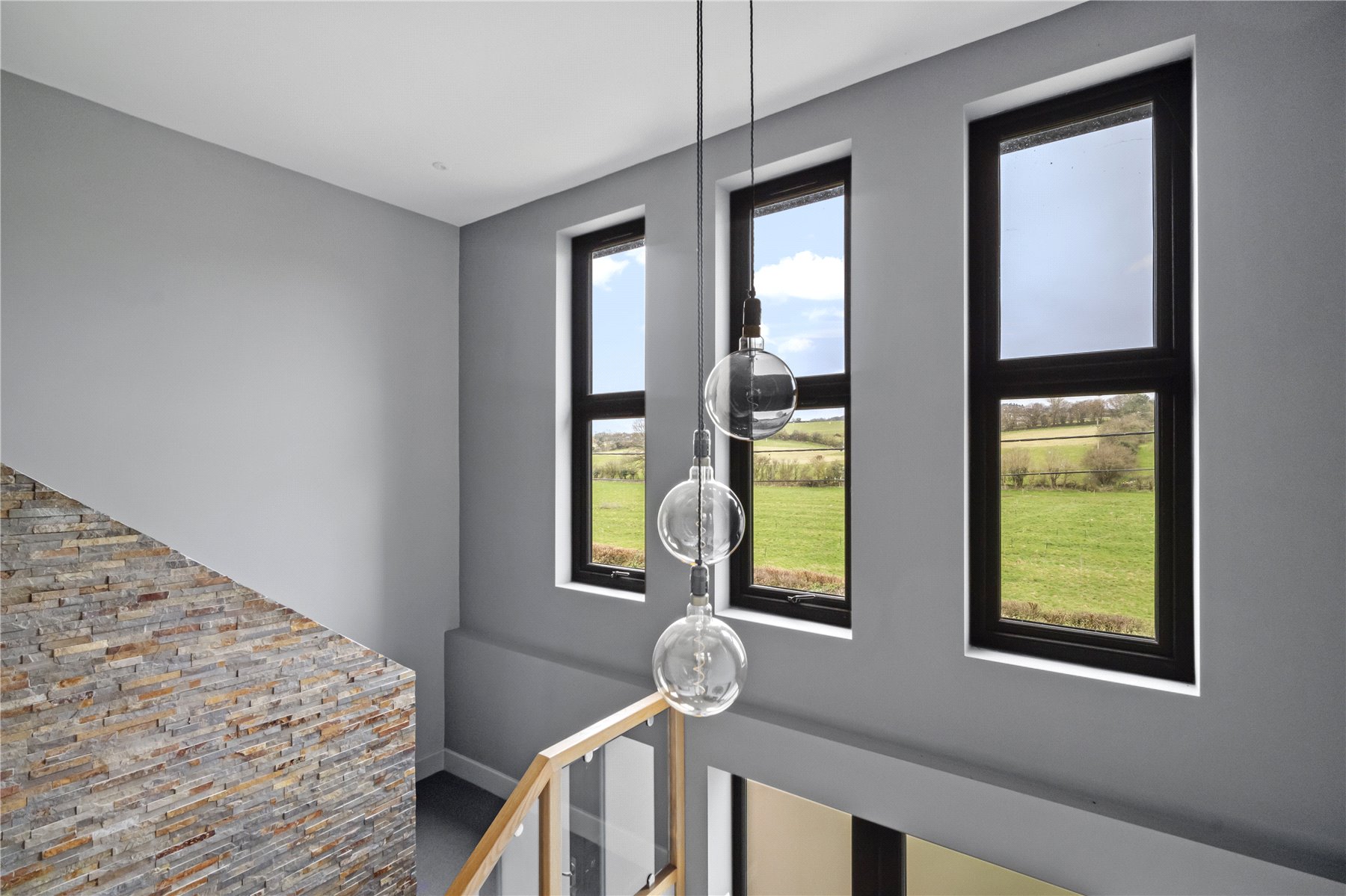 Ascend to the upper level, where three additional bedrooms await. The landing itself is worthy of note, exemplifying the high ceilings, quality finish and rural aspect. Each bedroom is thoughtfully designed to maximize comfort and privacy, with each offering a charming rural view. The PRINCIPAL BEDROOM is an expansive space, overlooking rolling fields through floor-to-ceiling windows. There is ample space for a suite of furniture, in addition to the fitted bed. Discreetly tucked away to the rear is a dedicated DRESSING ROOM with an abundance of cupboards and wardrobes, adjacent to the contemporary EN-SUITE with electric underfloor heating, with tops finished in quartz, and including a double shower, W.C and wash hand basin. BEDROOMS 2 and 3 are both double rooms, offering a delightful front or rear aspect, respectively. Finally, there is a generous, contemporary FAMILY BATHROOM with shower cubicle, W.C and wash hand basin over a quartz-topped vanity unit.