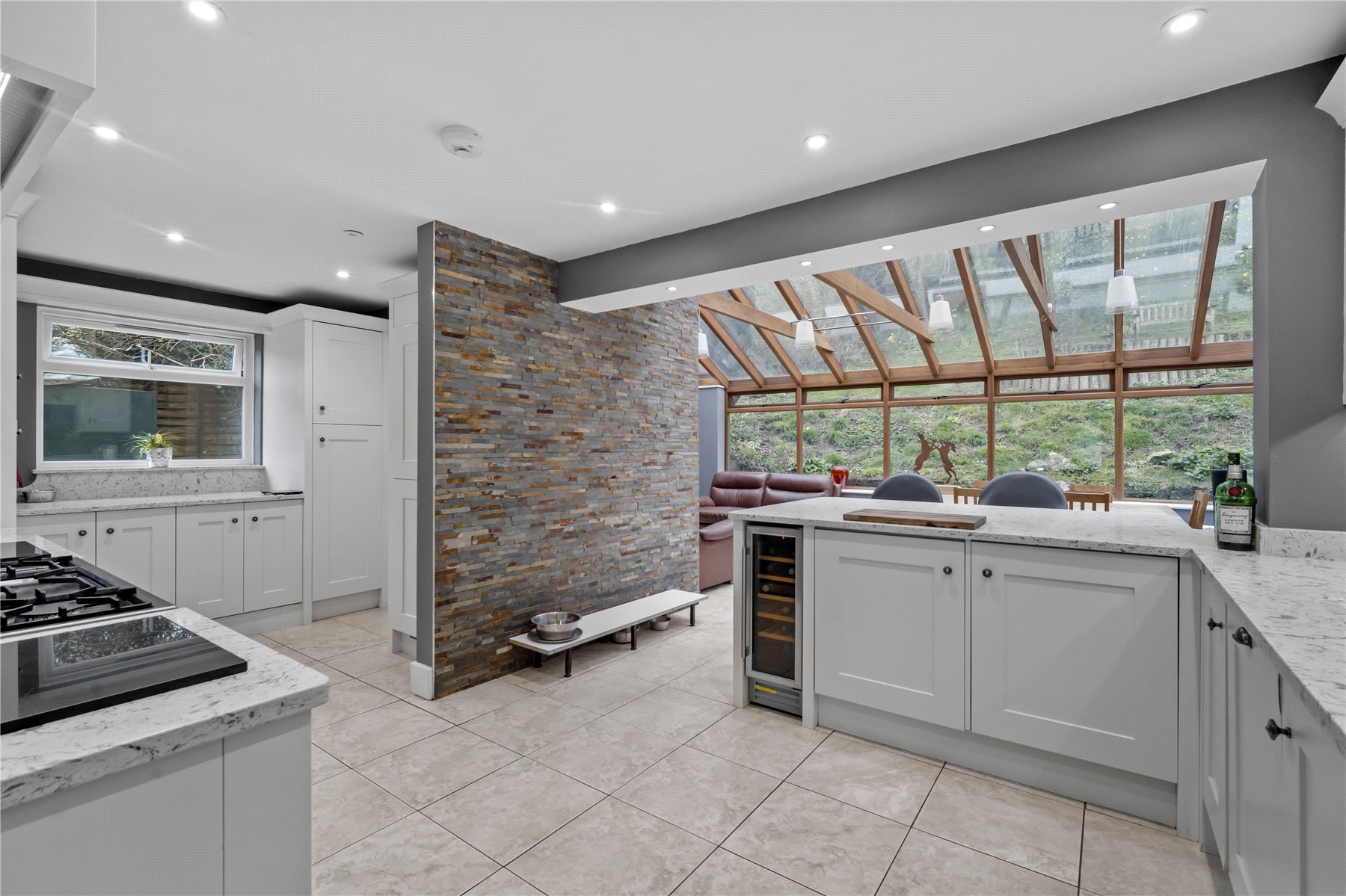 With high glass ceilings, the adjacent SUNROOM area is flooded with natural light, inviting you to relax and enjoy the tranquillity of the surrounding woodland garden. This space serves as a peaceful retreat, bringing the outdoors in. In addition to ample space for a dining table to enjoy the privacy, there is a cosy SNUG area, able to accommodate a sofa suite, which includes a multifuel burner. There is also access to the rear garden.