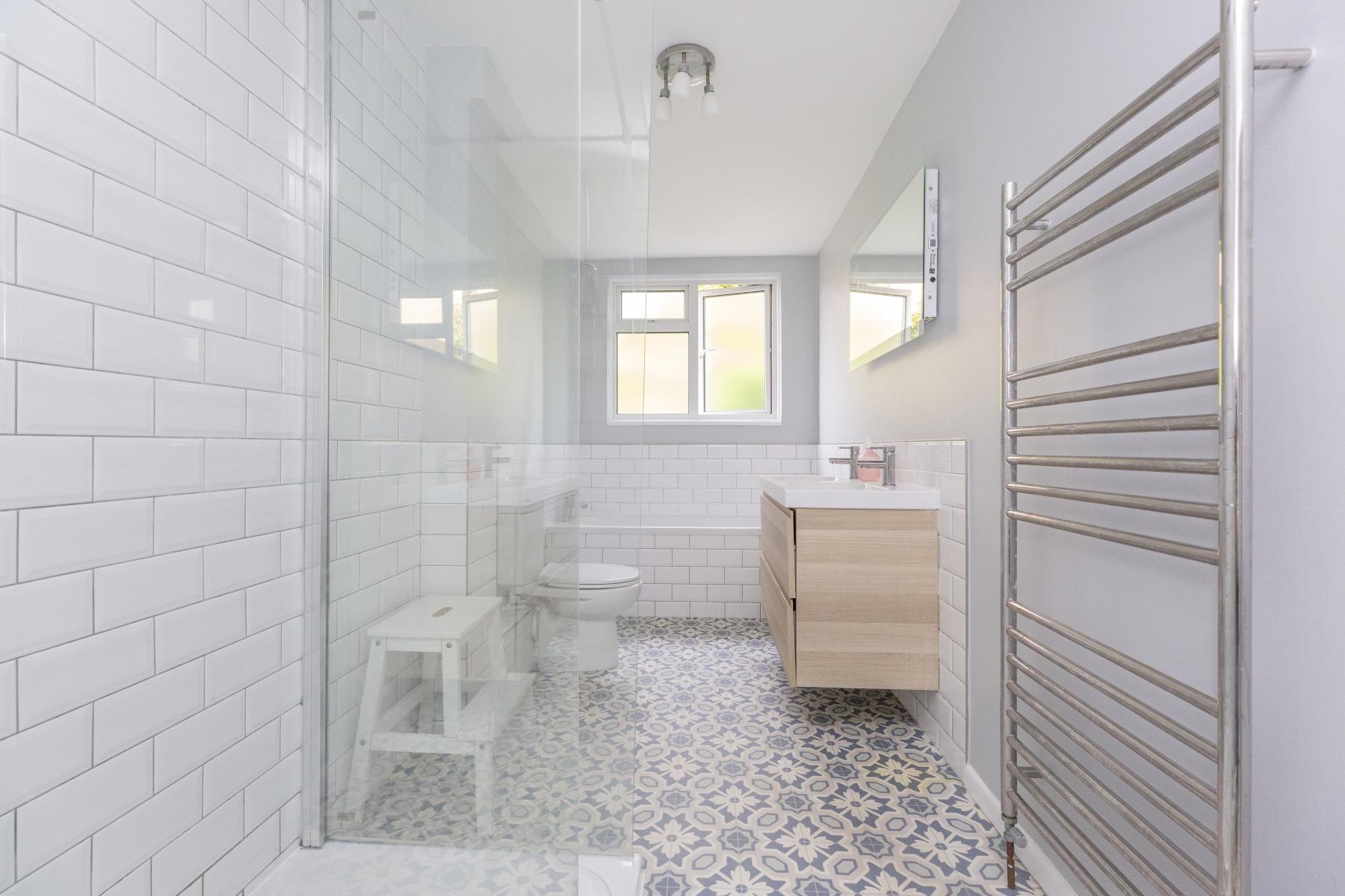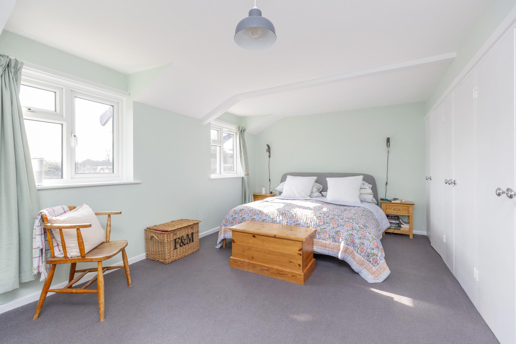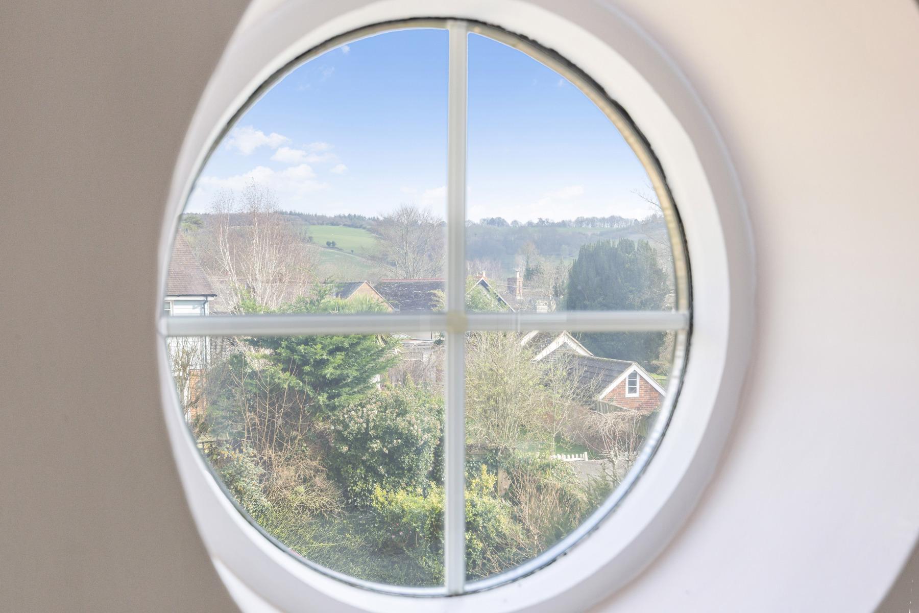 On the first floor the relaxed and bright feel of this house continues, calmy decorated with a soft and complimentary pastel palette. The are four generous double bedrooms, all well-proportioned and each one has at least double aspect windows with views over the surrounding village and countryside. The PRINCIPLE BEDROOM overlooks the garden and the village and hills beyond. It is very generous with a row of built-in wardrobes and space to add an ensuite shower room. BEDROOM TWO is at the front of the house and has a feature porthole window with pretty views, a storage area and sink. BEDROOM THREE is a great size double bedroom, with an office nook and a large window allowing light to flood in. BEDROOM FOUR, another good size double room, with a built-in wardrobe and double aspect windows. The modern, pretty FAMILY BATHROOM has been attractively designed and consists of a bath, separate walk-in shower cubicle, double wash hand basins with built-in vanity storage unit and a W.C.