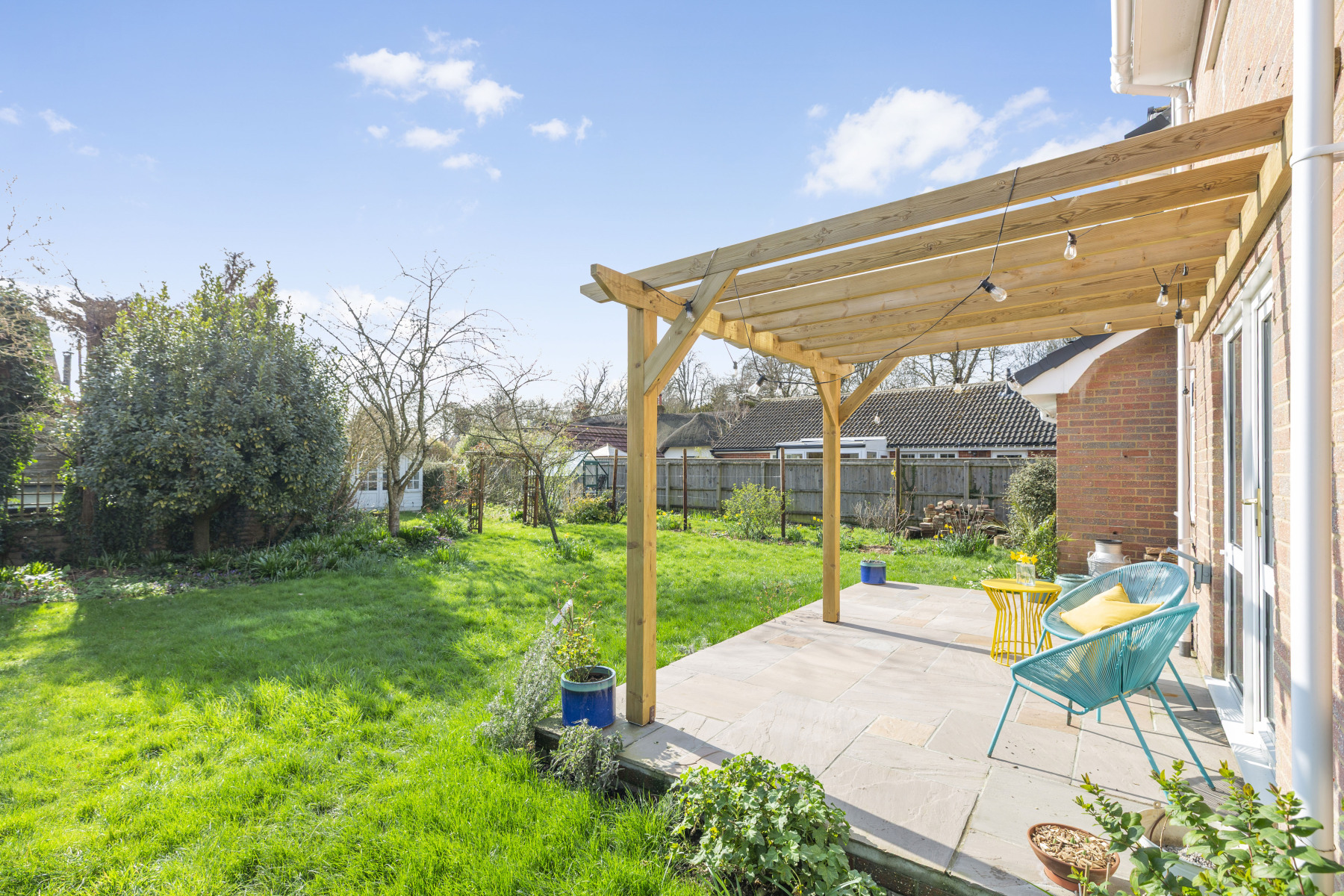 The garden is well proportioned and wraps around three sides of the house and enjoys a predominantly southerly aspect. Enclosed by mature hedging and fencing, it is full of interest, with a large lawn area, well-stocked flower beds, mixed shrubs, and several established trees. There are raised beds for vegetables, a GREENHOUSE and a timber SUMMERHOUSE, so plenty of opportunity for pottering about. There are two patio areas, one outside the kitchen and one outside the sitting room with a wooden pergola that creates a lovely spot for outdoor dining.
