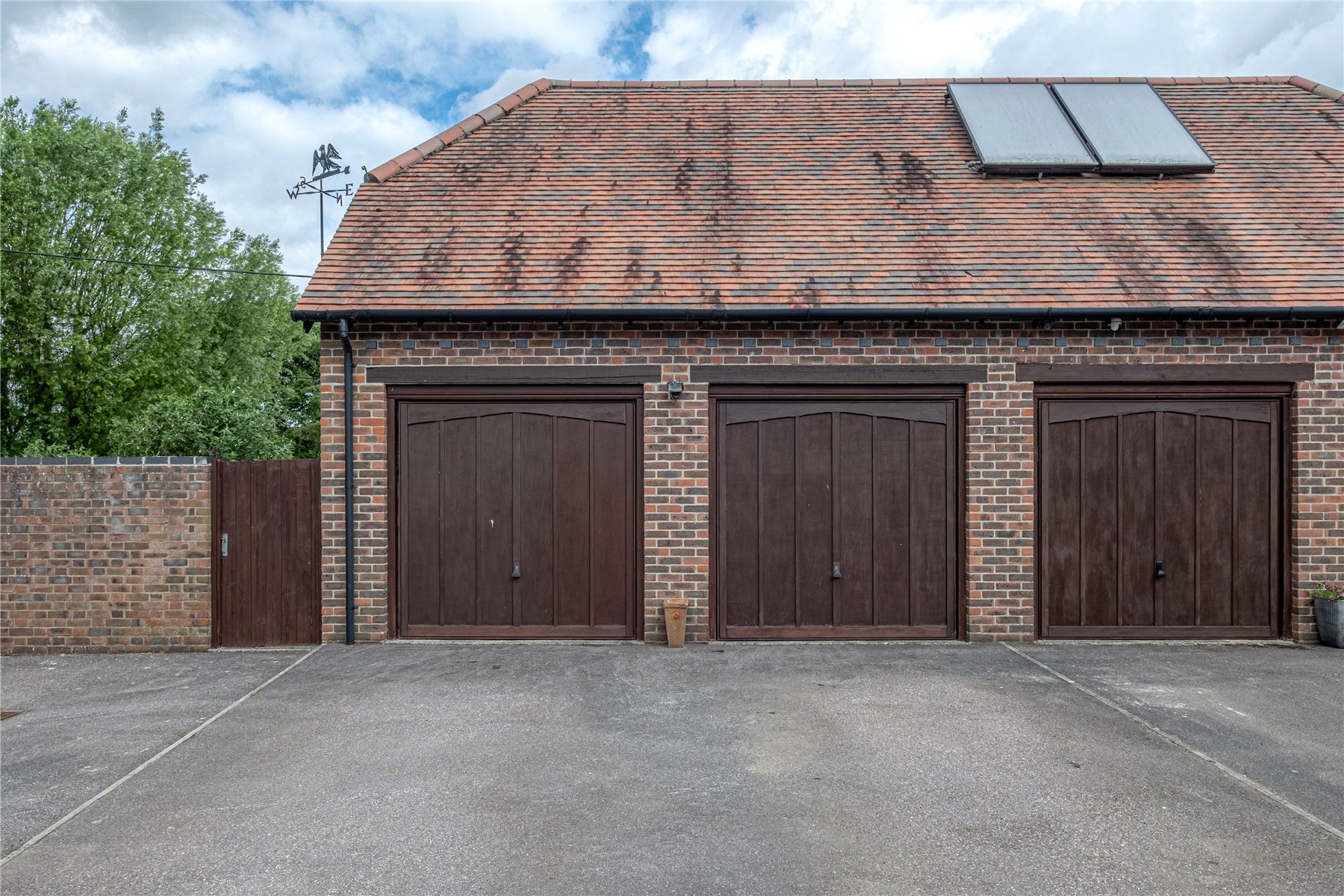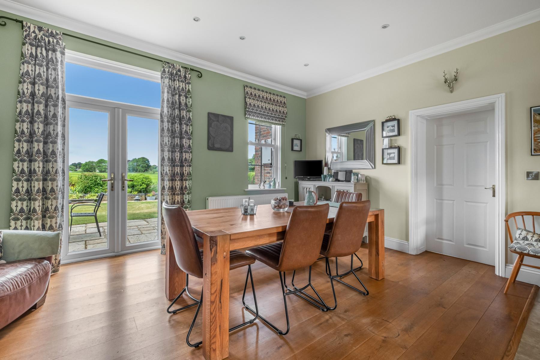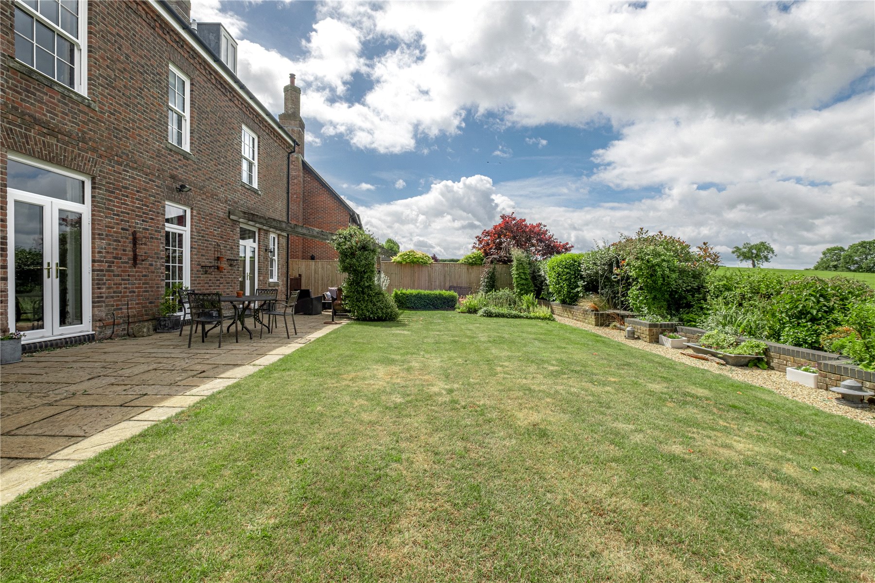 Outside, the rear garden is laid mainly to lawn with a patio seating area, perfect for al fresco dining. Beyond the garden, open fields stretch out, giving a sense of space and connection to the countryside. The property also benefits from a further fifth of an acre adjoining on the north side under a garden licence for a peppercorn rent. This provides further space for a play area, vegetable patch or could be opened up into the main garden. This land can be purchased under separate negotiation with the landowner. At the front, the property is framed by an attractive brick façade and a striking red front door. A DOUBLE GARAGE and driveway provide ample off-road parking.